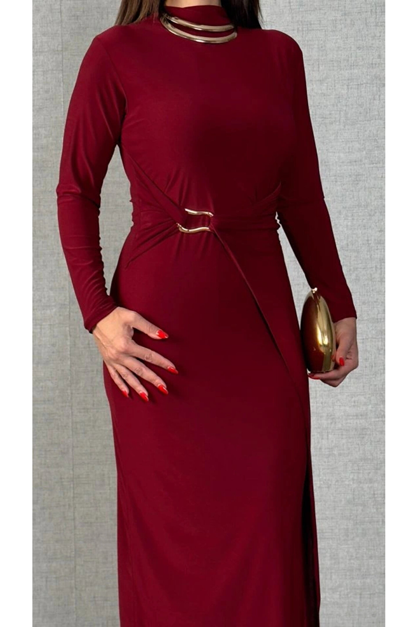 Kadın Balıkçı Yaka Toka Detay Sandy Kumaş Midi Boy Elbise