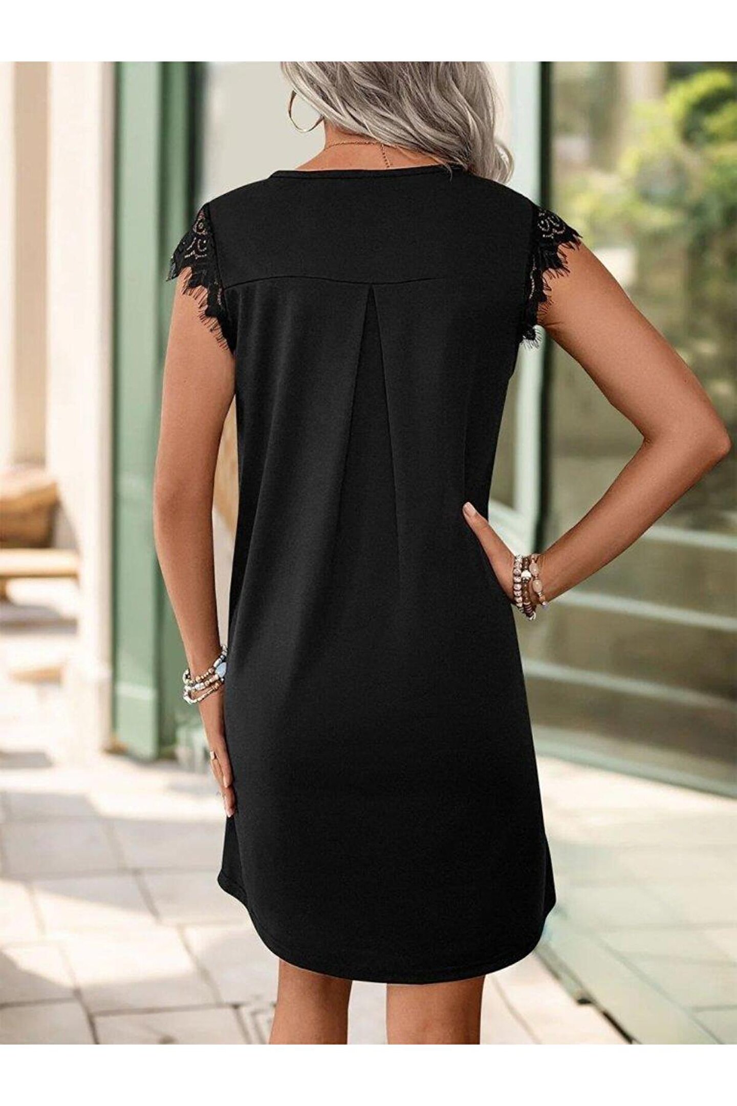 Kadın Kısa Dantel Kollu önden Düğmeli Viskon Elbise