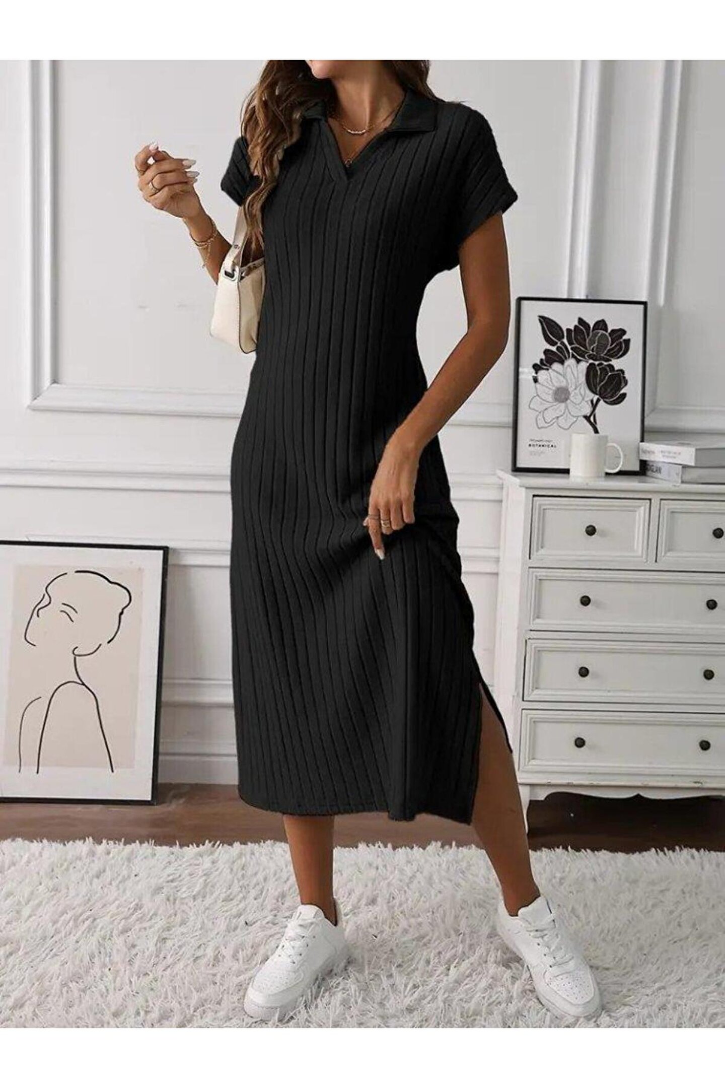 Butik Kadın Kısa Kollu Yakalı Yandan Yırtmaçlı Kalın Fitilli Kaşkorse Elbise