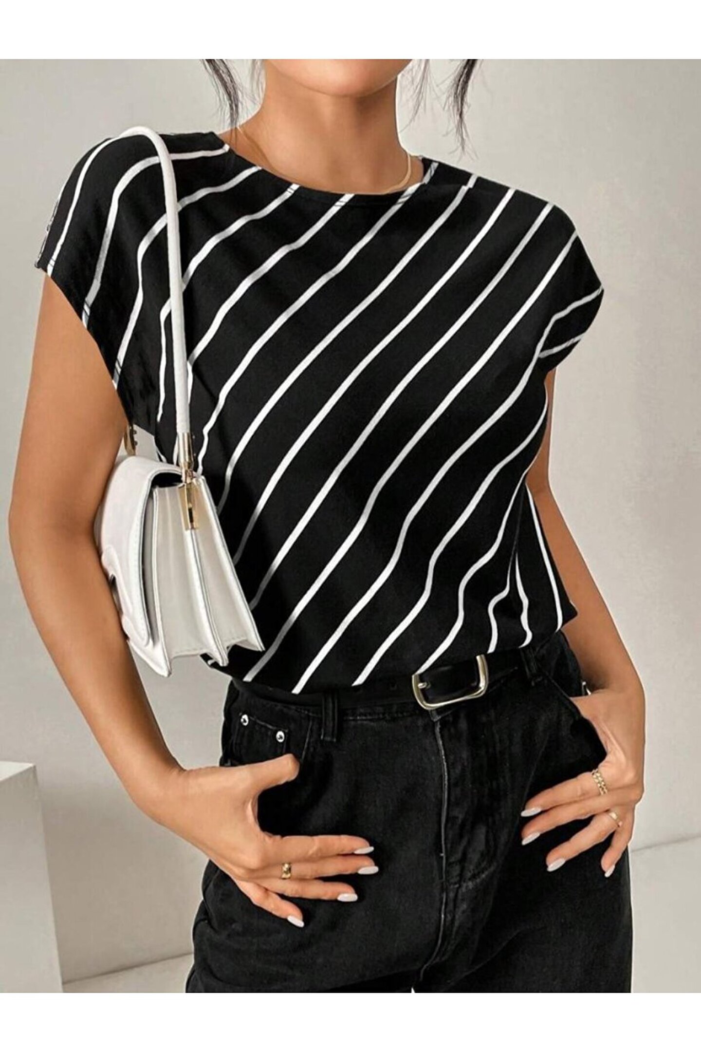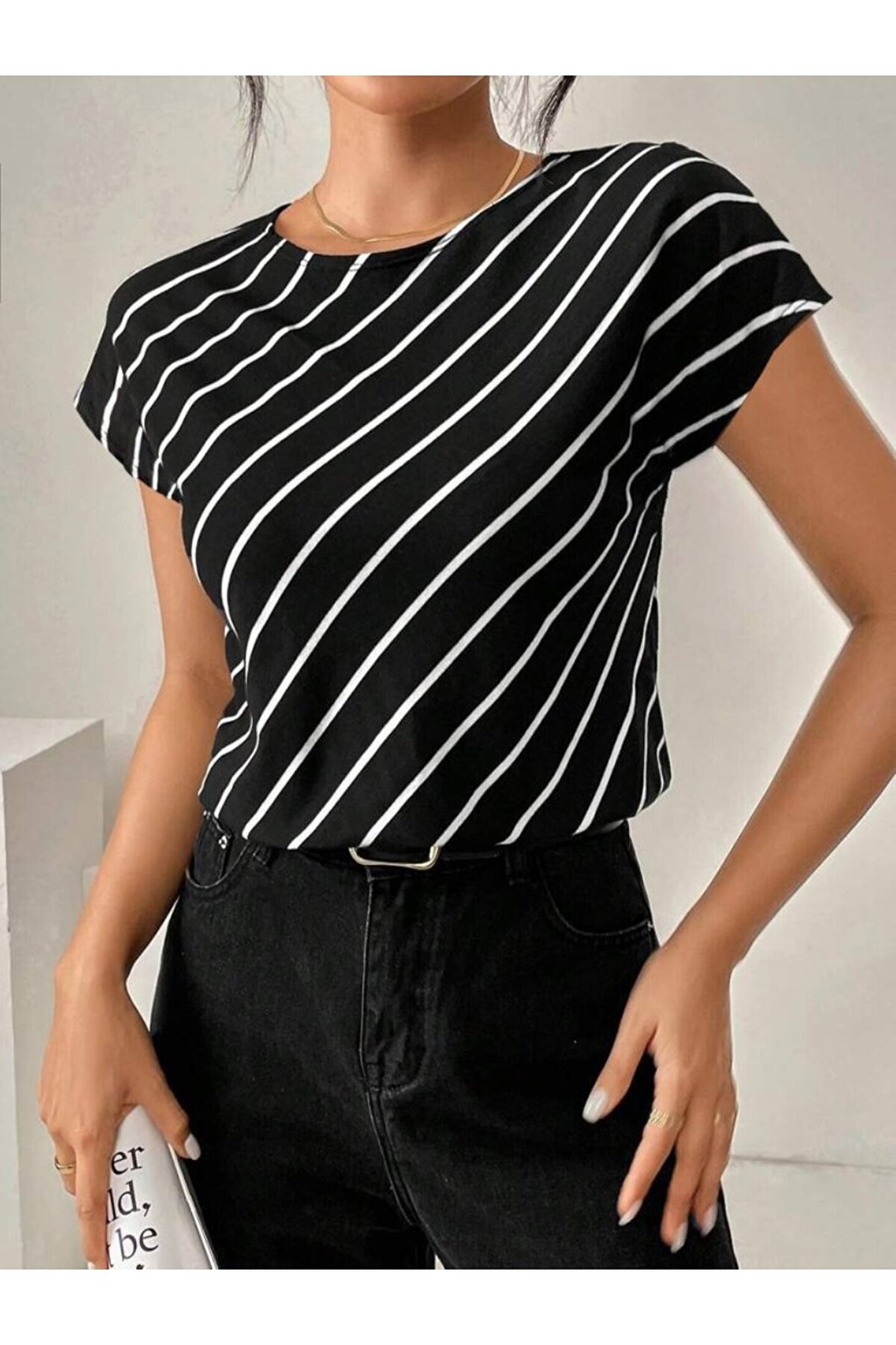 Butik Kadın Kısa Yarasa Kollu Bisiklet Yaka çizgi Desenli Atlas Bluz