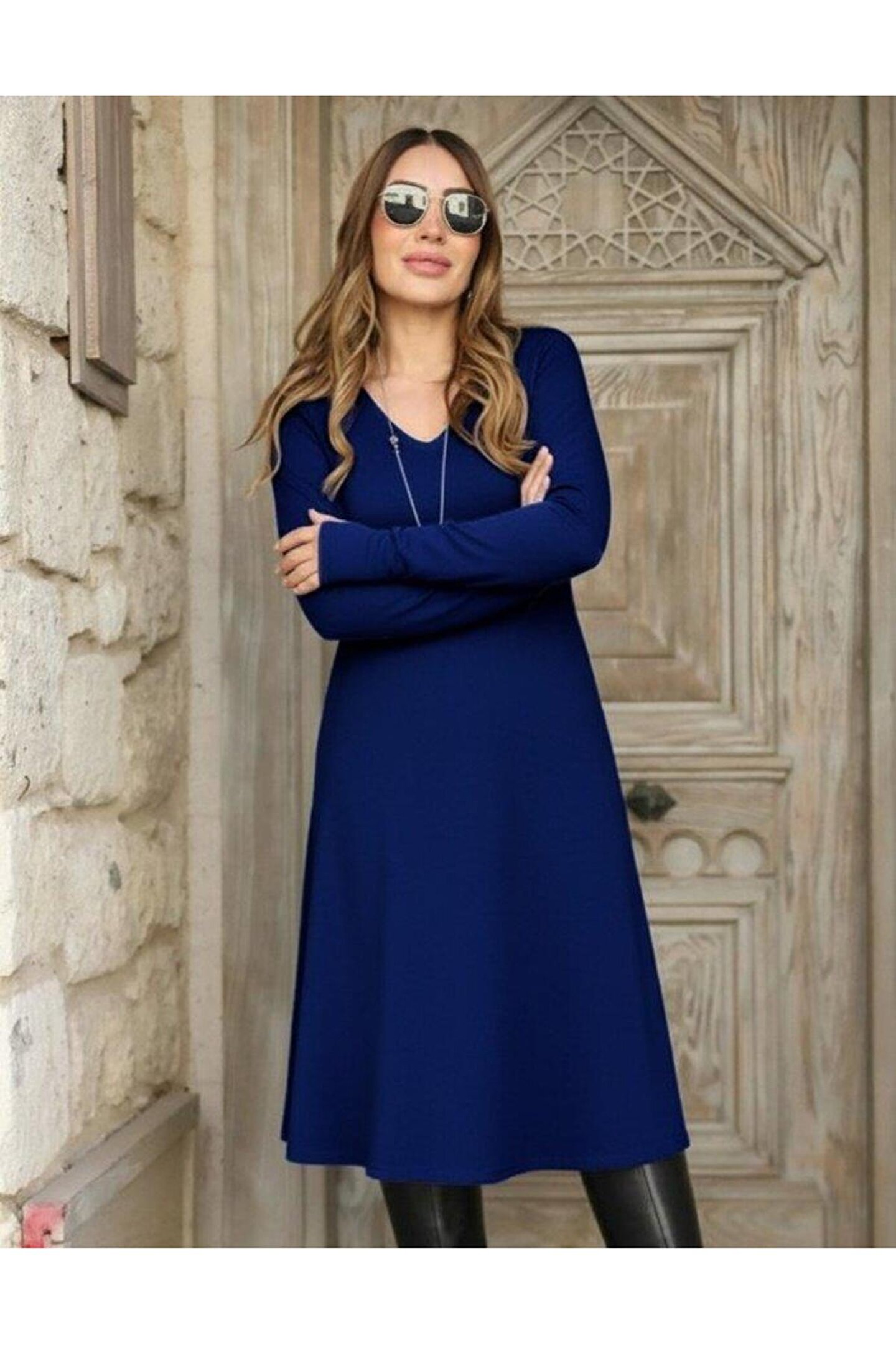 Kadın Uzun Kollu V Yakalı Salaş Midi Akrilik Elbise