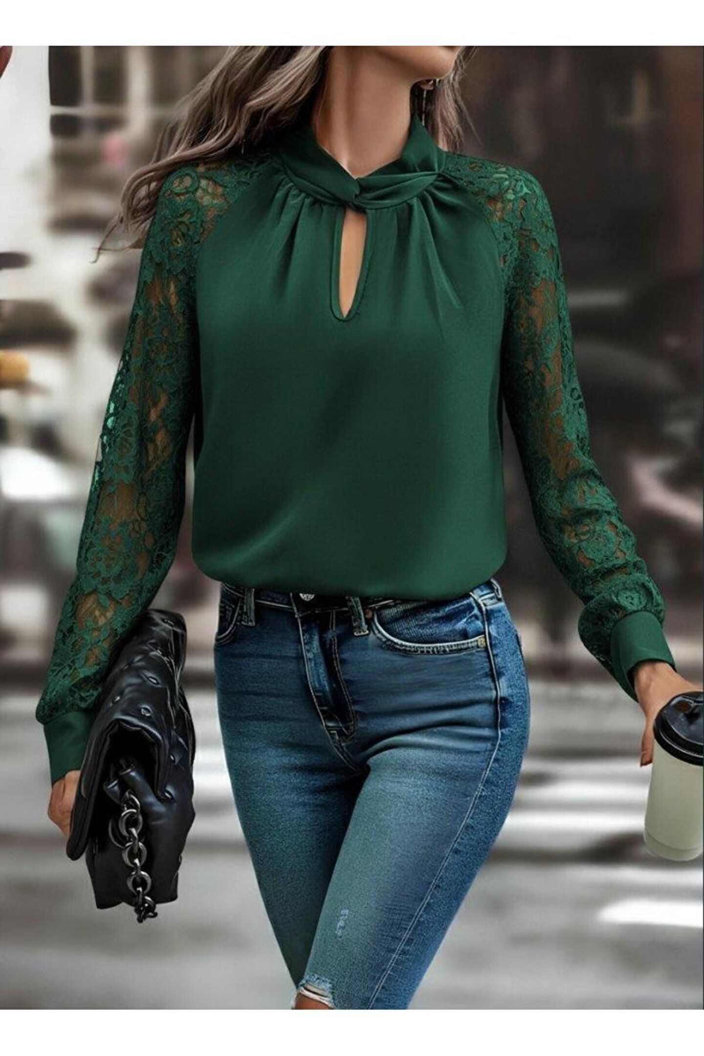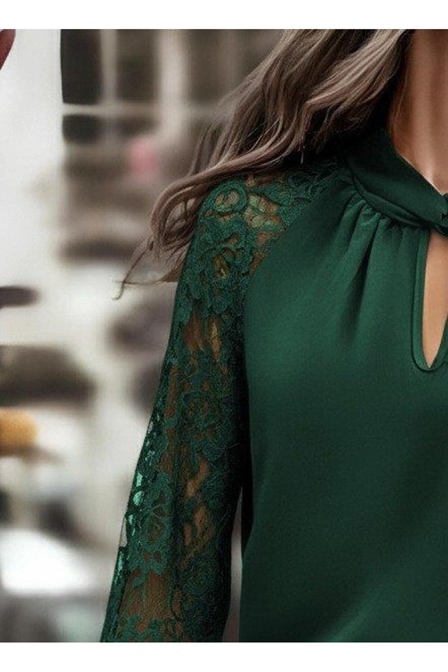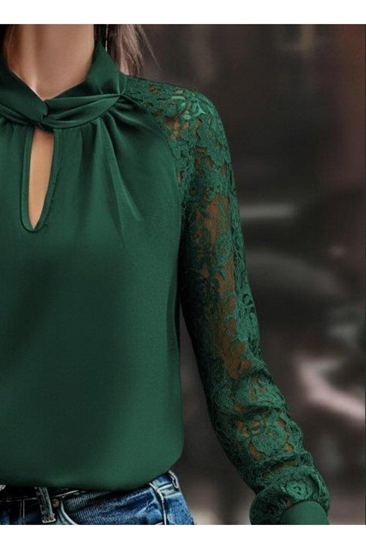 Butik Kadın Uzun Kollu Yaka Düğme Detay Güpürlü Kol Krep Bluz