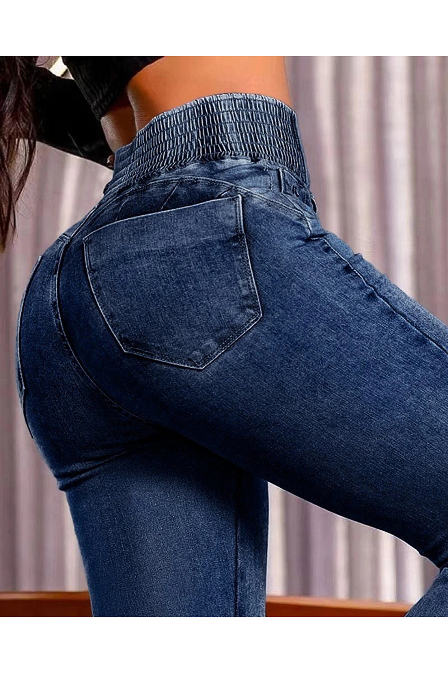 Butik Kadın Yüksek Bel Yanları Lastik önü Düğmeli Kot Pantolon