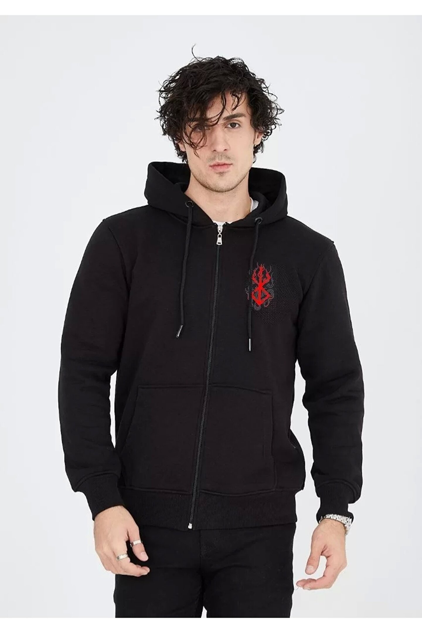 Butik Unisex Baskılı Tam Fermuarlı Kapşonlu SweatShirt - Siyah