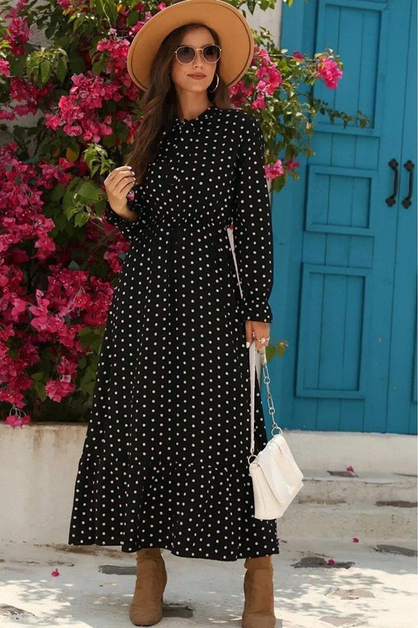 By Sevilen Collection Kadın Uzun Kollu Yakası Bağcıklı Uzun Puantiyeli Krep Maxi Elbise