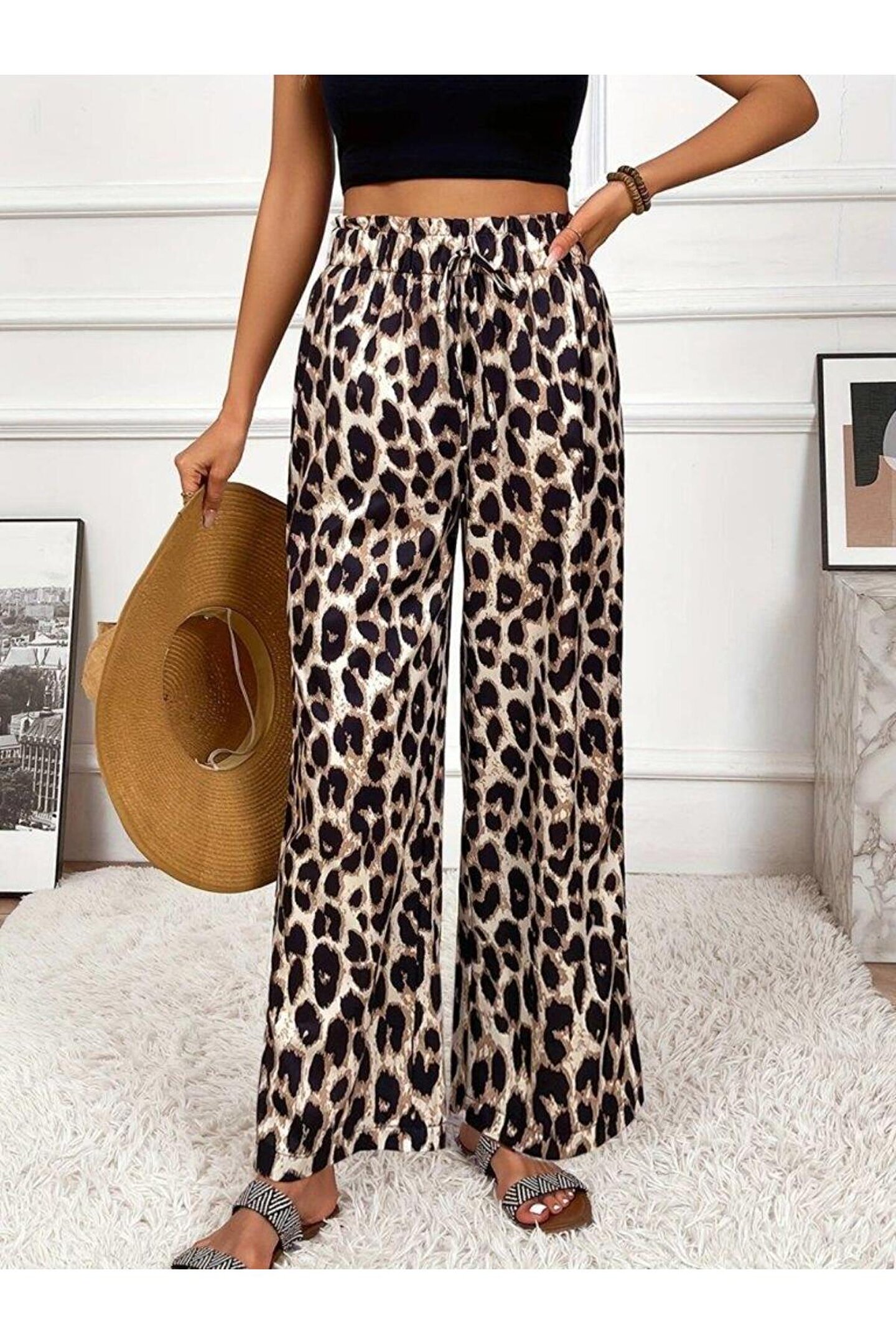 BZ Boutique Kadın Yüksek Bel Beli Lastikli Bağcıklı Leopar Desenli Süprem Pantolon
