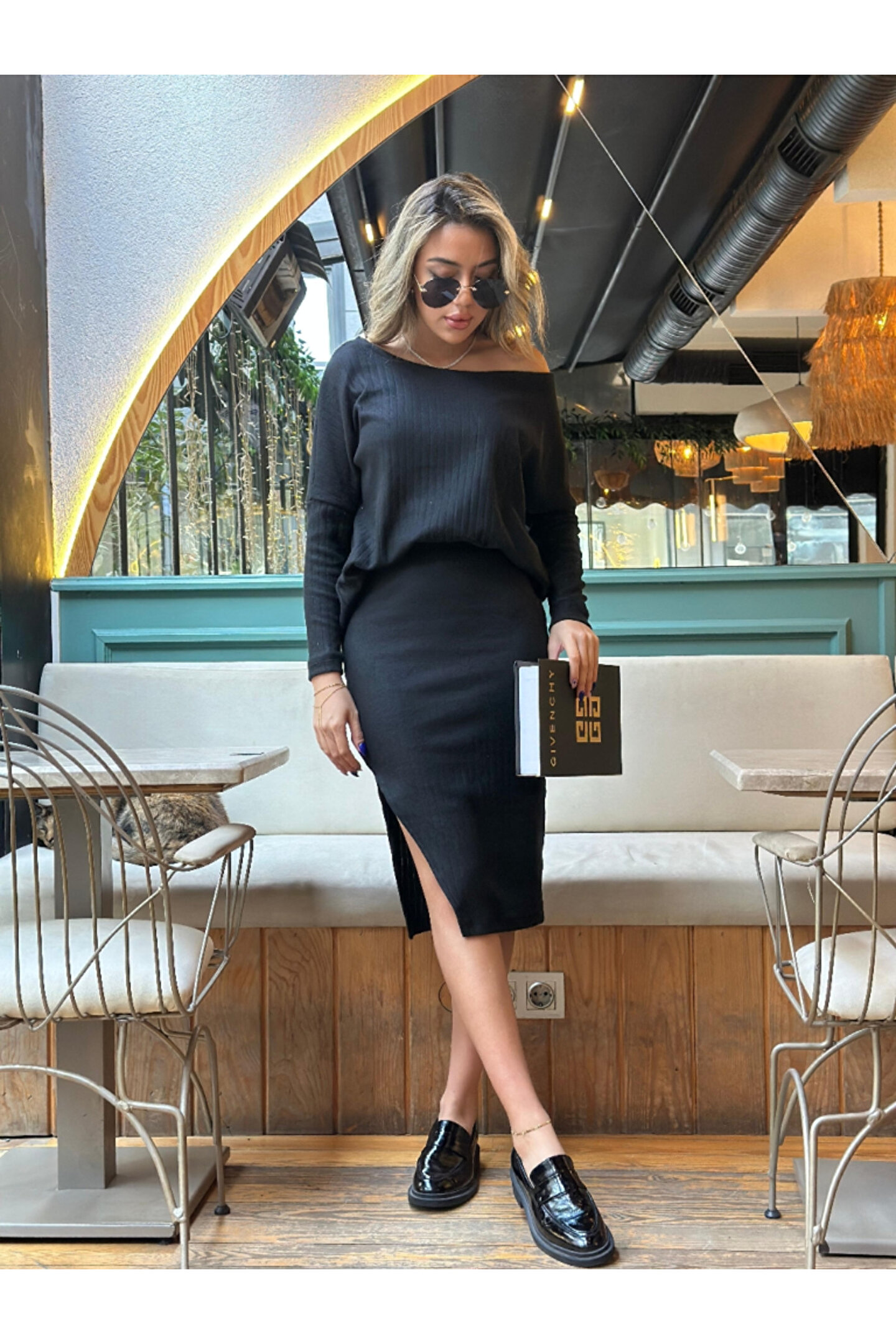 Kadın Uzun Kollu Düşük Omuz Yırtmaç Detay Kaşkorse Etek Bluz Ikili Takım