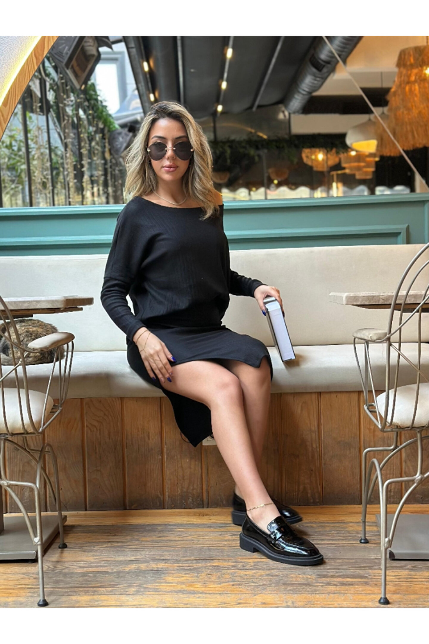 cananataç Kadın Uzun Kollu Düşük Omuz Yırtmaç Detay Kaşkorse Etek Bluz Ikili Takım