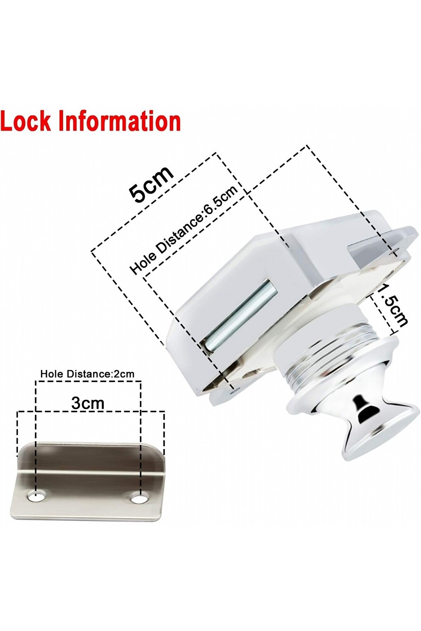 Karavan mobilyaları, dolaplar, yat/karavan çekmeceleri, tekne masaları, dolap kapıları, duvar dolapları vb. için kullanılır.; Özellikler - 26 mm çaplı dolap kapısı delikleri ve 15 ila 18 mm çoğu dolap kapısı/çekmecesinin kalınlığı için uygundur. Sabitleme vidası mesafesi: 64,62 mm.; Malzeme – Ağırlıklı olarak ABS plastik kabuk. Kilit silindiri çinko alaşımdan oluşur.; Paket içeriği: 1 adet çıtçıt kilit. Her biri 4 x vida ve 1 x emniyet sacı.;