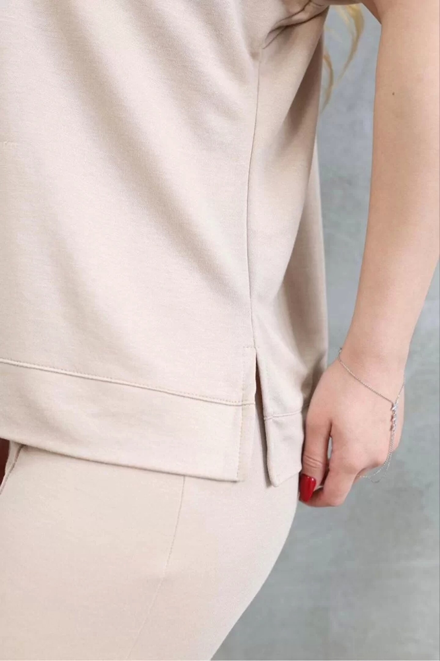 CanselButik Osy Bej Yumuşak Dokulu Kumaş Bisiklet Yaka Kısa Kollu Kadın Alt Üst Takım