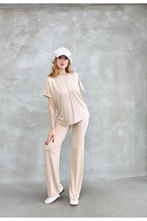 Osy Modal Yumuşak Dokulu Kumaş Bisiklet Yaka Kısa Kollu Takım - Bej