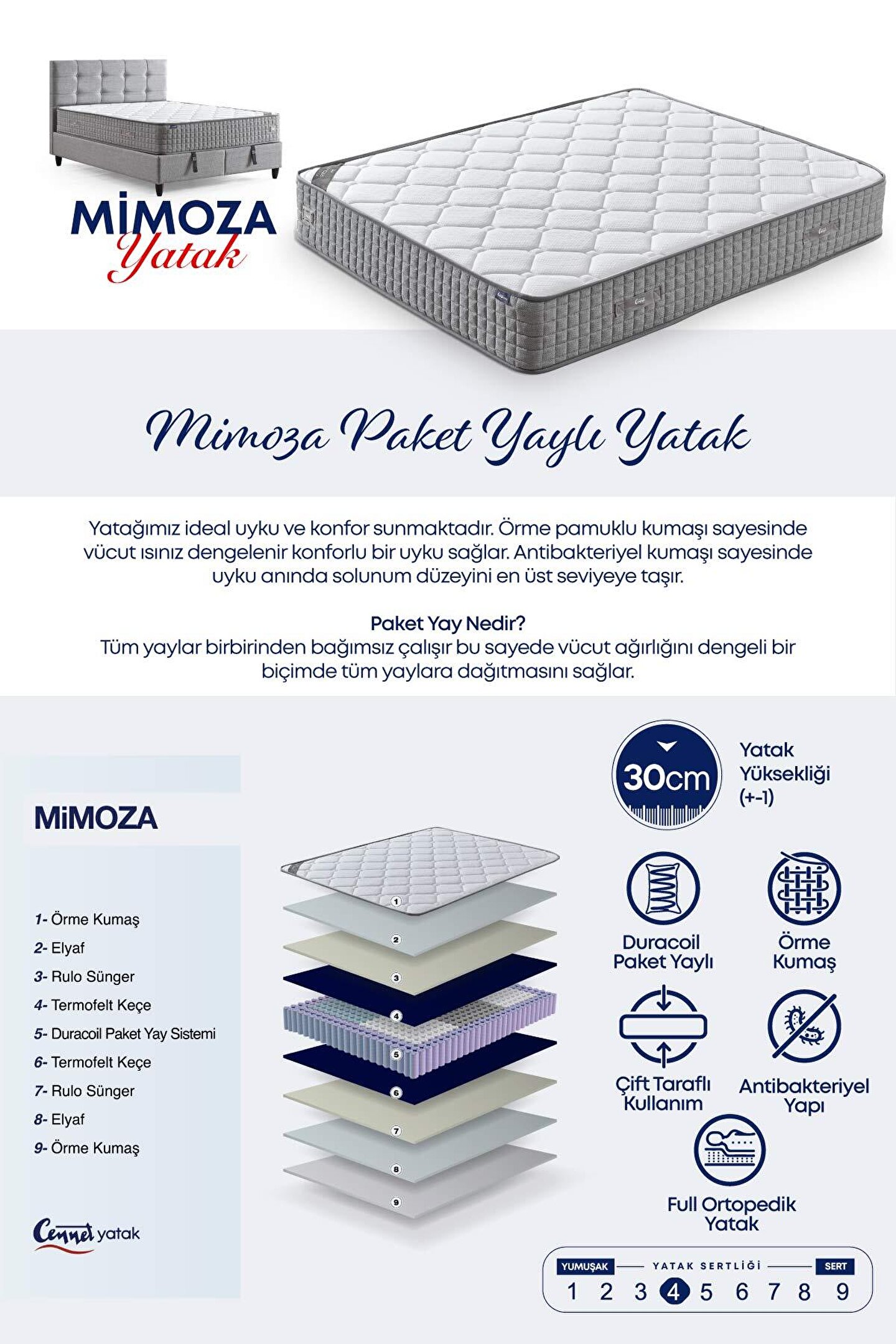 Tek Kişilik Mimoza Yatak – Vücuda Özel Destek ve Hava Dolaşımı Mimoza Yatak Özellikleri Mimoza Yatağımız, pocket yay sistemi ile üstün destek sağlayarak vücut ergonomisini korur.; Orta sertlikteki yapısı, ideal konfor ve destek dengesi sunarken, kaliteli bir uyku deneyimi yaşatır.; Şıklığı ve dayanıklılığı bir arada sunan bu özel yatak, her güne zinde başlamanız için tasarlandı.; Yay Sistemi – Adaptif Paket Yay Teknolojisi Yay: Duracoil Pocket yay (Torba Yay) sistemi, farklı basınçlara bağımsız yanıt vererek kişiye özel konfor sunar.; Avantaj: Omurga hizalamasını destekleyerek sabahları daha dinç uyanmanıza yardımcı olur.; Destekleyici Sünger Sünger: 24 DNS yoğunluğa sahip destek süngeri, çökme yapmadan uzun süre dayanıklılık sağlar.; Kumaş Özellikleri Kumaş: Nefes alabilen ve antialerjik özellikli özel örme kumaş ile kaplanmıştır.; Yatak Kalınlığı Yükseklik: 30 cm (standart model) Ekstra Konfor Özellikleri Ekstralar: İki yönlü kullanım, destekli katman ile hijyenik kullanım Paketleme : Roll Pack şeklinde gönderilmektedir.; Yatağın tam formuna gelmesi 48 - 72 saat arasındadır Teslimat ürün kapınıza kadar yapılır.; 2 yıl garantilidir.