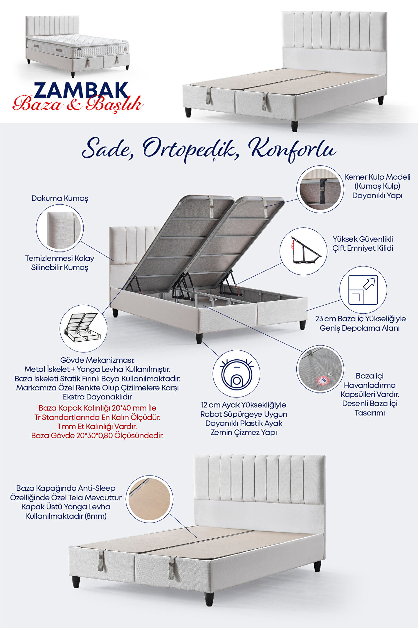 Çift Kişilik Zambak Başlık & Baza Takımı & Yatak 3 lü Set Zambak Başlık Özellikleri Kumaş ve Konfor Kumaş Türü: Dokuma kumaş Özellik: Sünger dolgulu ve kolay silinebilir yapı Ölçüler Yükseklik (Boy): 101 cm Derinlik: 7 cm Zambak Baza Özellikleri Kumaş ve Malzeme Kumaş Türü: Dokuma kumaş Çevresi: Sünger dolgulu, kolay silinebilir yüzey Kapak Kalınlığı: 20x40 mm (TR standartlarında en kalın ölçü) Kapak Üstü : Kaydırmaz Tela Kullanılmıştır Et Kalınlığı: 1 mm Gövde Ölçüsü: 20x30x0.80 mm İskelet: Statik fırınlı boya, çizilmeye karşı ekstra dayanıklı ve markaya özel renkte Teknik Detaylar Baza Tipi: Sandıklı baza Depolama Alanı: 23 cm iç yükseklik Kulp Tipi: Kemer model kumaş kulp Ayak Yüksekliği: 12 cm (robot süpürge uyumlu) Gövde Mekanizması: Metal iskelet + yonga levha Güvenlik ve Dayanıklılık Emniyet: Yüksek güvenlikli emniyet kilidi Kapakta: Anti-Sleep özellikli özel tela Garanti: 2 yıl Zambak Yatak Özellikleri Yay Sistemi Yay: Vücutla uyumlu 5 Zone'lu paket yay teknolojisi, hareket izolasyonu ile kesintisiz uyku sağlar.; Yay Özelliği: Sessiz ve bağımsız çalışan yay sistemi ile gece boyunca denge korunur.; Konfor Katmanı Sünger: Orta sertlikte 24 DNS ortopedik konfor süngeri Kaplama ve Kumaş Kumaş: Antibakteriyel ve hava geçirgen örme kumaş kaplama Katman : Kendinden Sabit Pedli Yatak Yüksekliği Toplam Yükseklik: 30 cm (model ve katman yoğunluğuna göre değişebilir) Ekstra Özellikler Kullanım: Tek taraflı, uzun ömürlü kullanım avantajı Hijyen: Temizlenebilir kumaş Paketleme : Roll Pack şeklinde gönderilmektedir.; Yatağın tam formuna gelmesi 48 - 72 saat arasındadır Nakliye bina önü değil, kapı teslimidir.