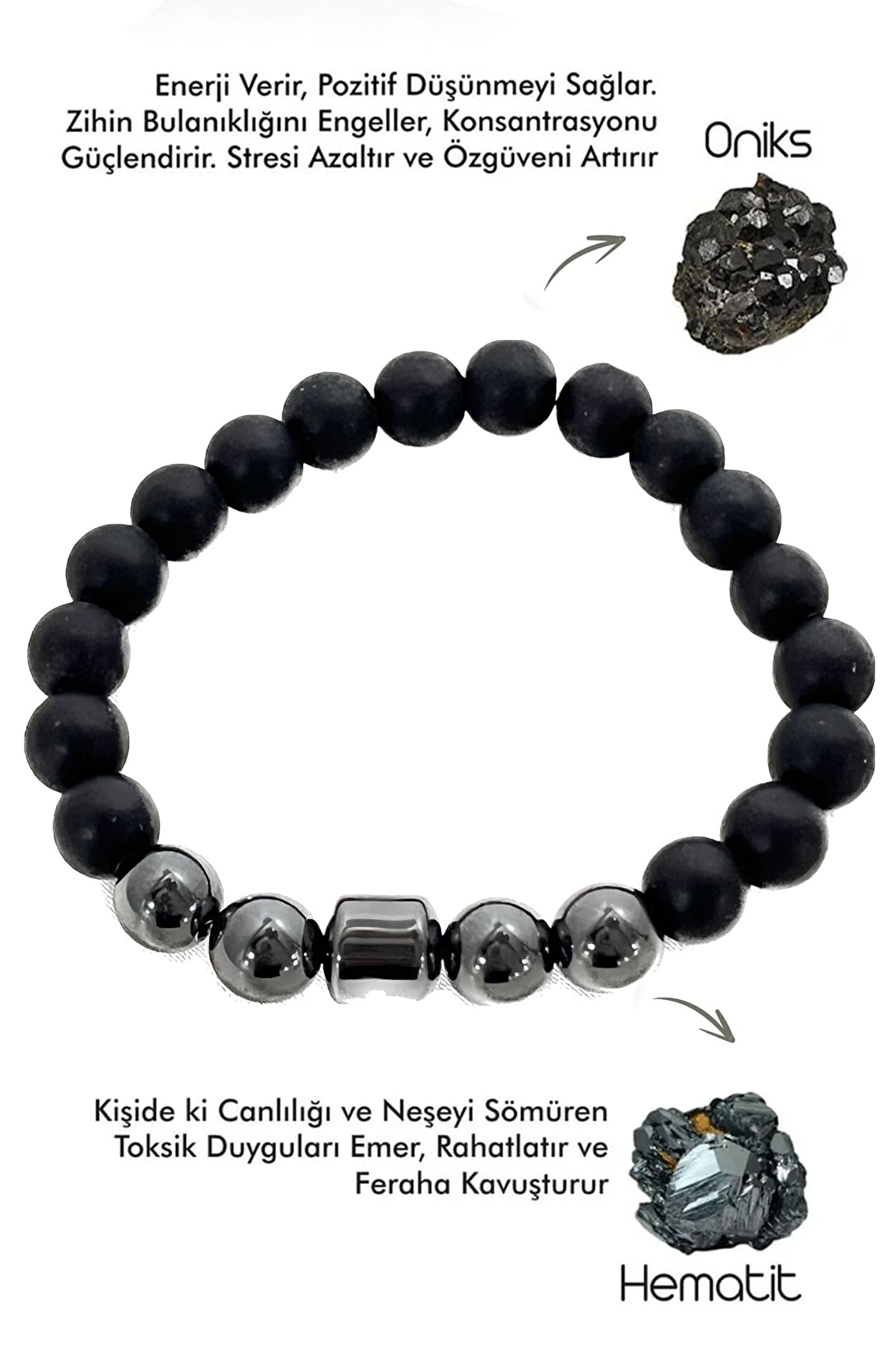 Doğal taş kullanımı sayesinde her bileklik benzersiz ve otantik bir görünüm sunar; Oniks ve hematit doğaltaşı kombinasyonu, hem şıklığı hem de zarafeti bir arada barındırır; Gençlerin enerjisine hitap eden tasarımıyla, günlük kullanımda rahatlık ve stil sağlar; Huzur ve mutluluk tılsımı olarak tasarlanmış bu bileklik, pozitif enerjilerle dolu anların vazgeçilmez aksesuarı olur;