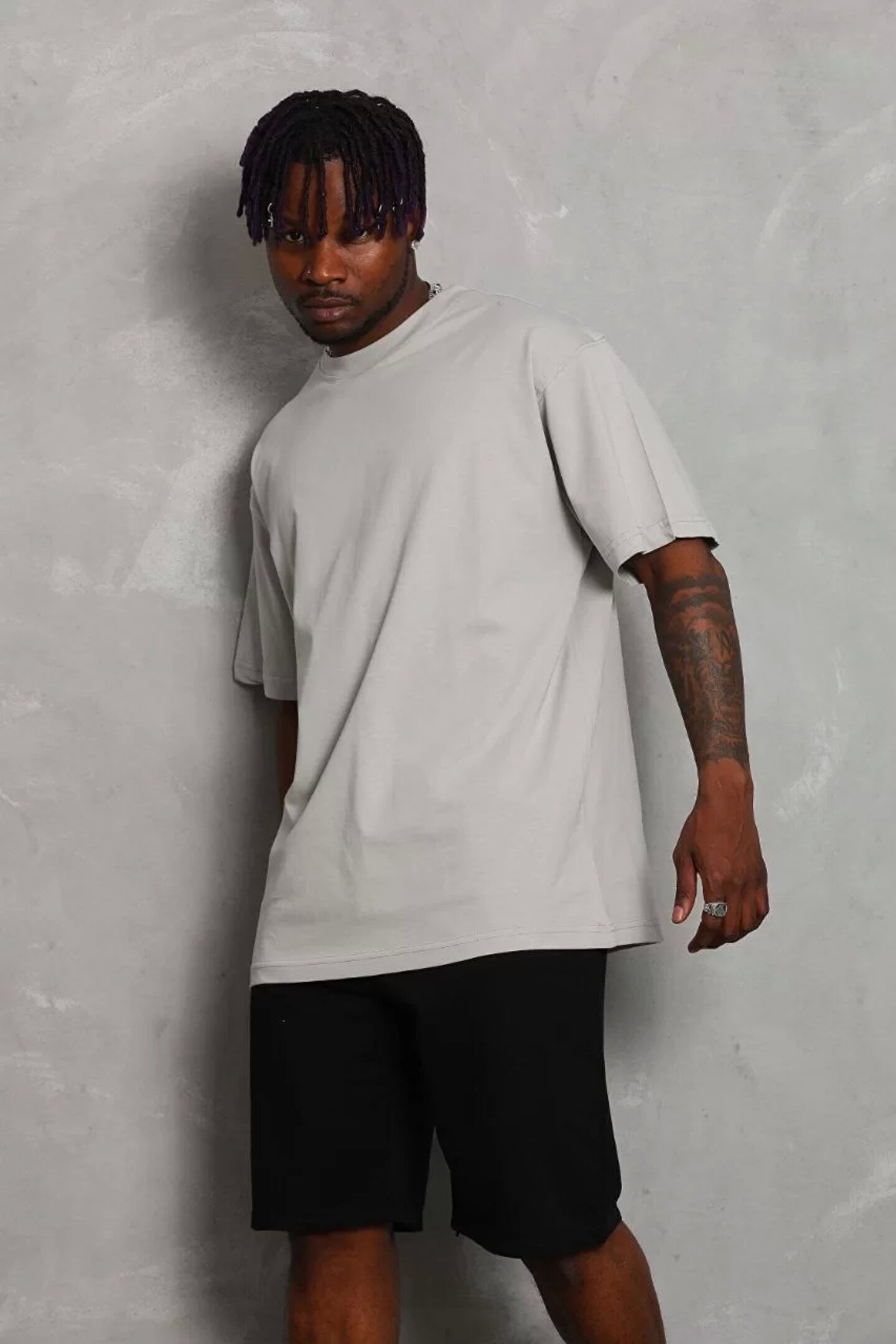 Unisex Oversize Düz Bisiklet Yaka T-Shirt - Gri