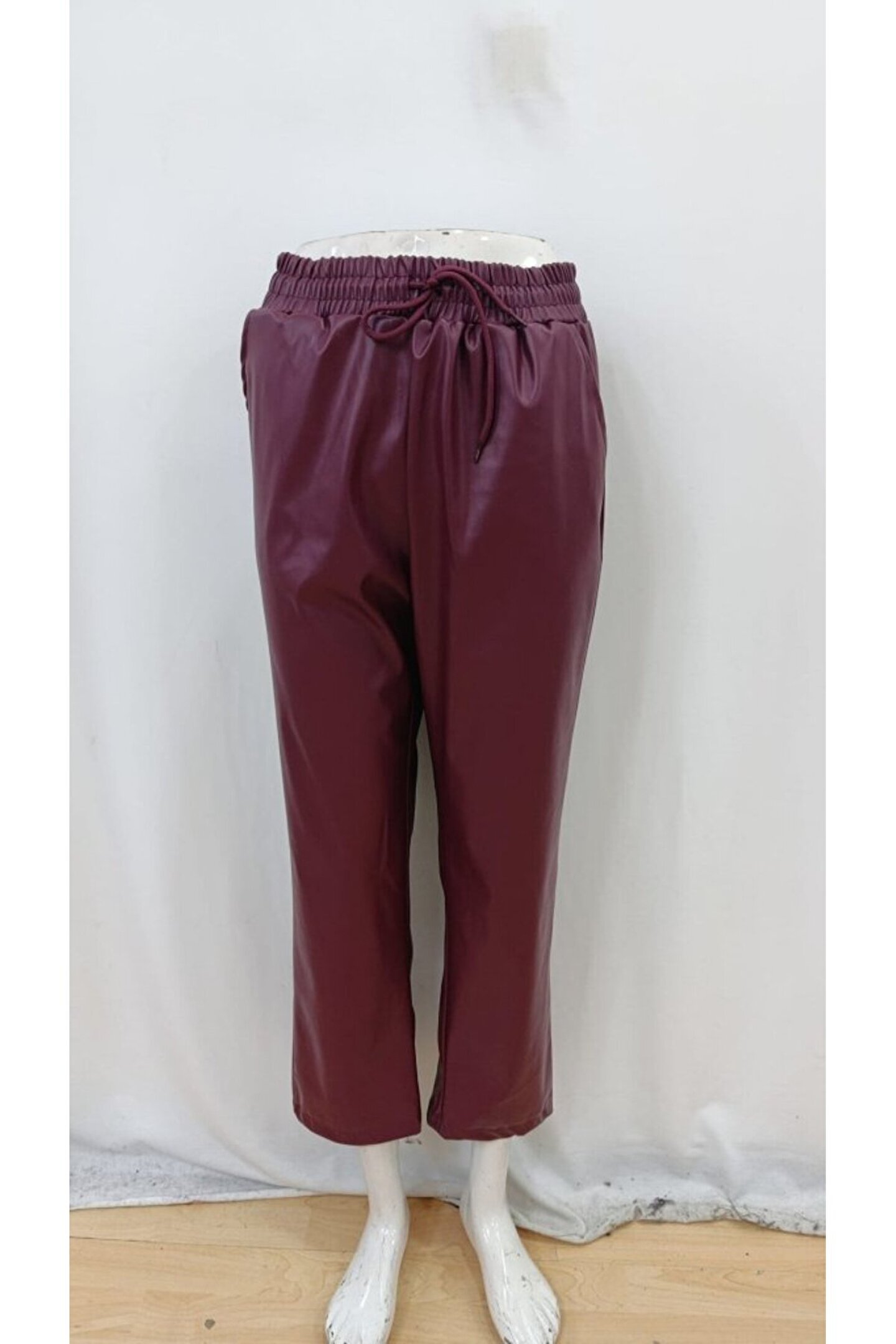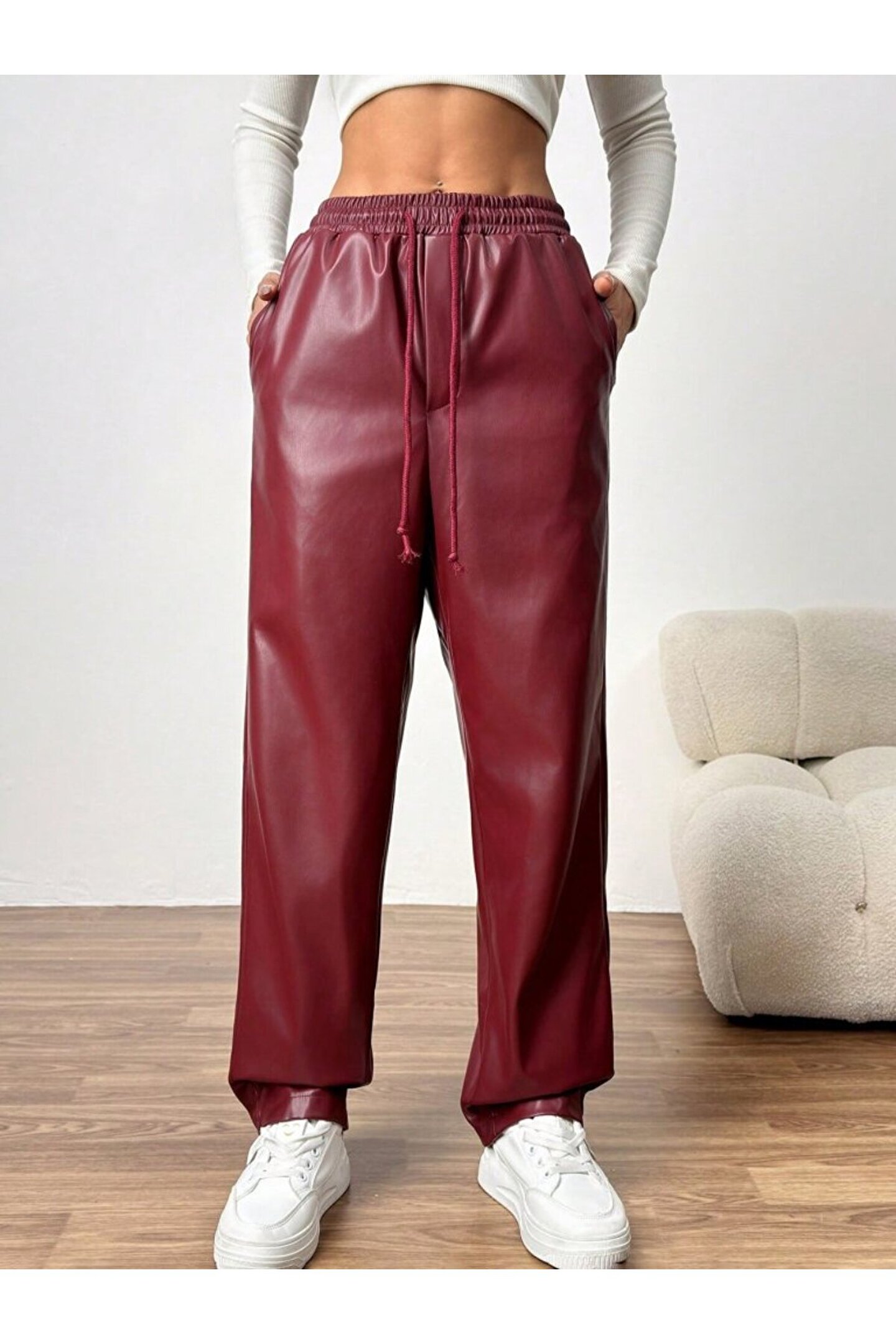 Kadın Yüksel Bel Bağcıklı Deri Pantolon