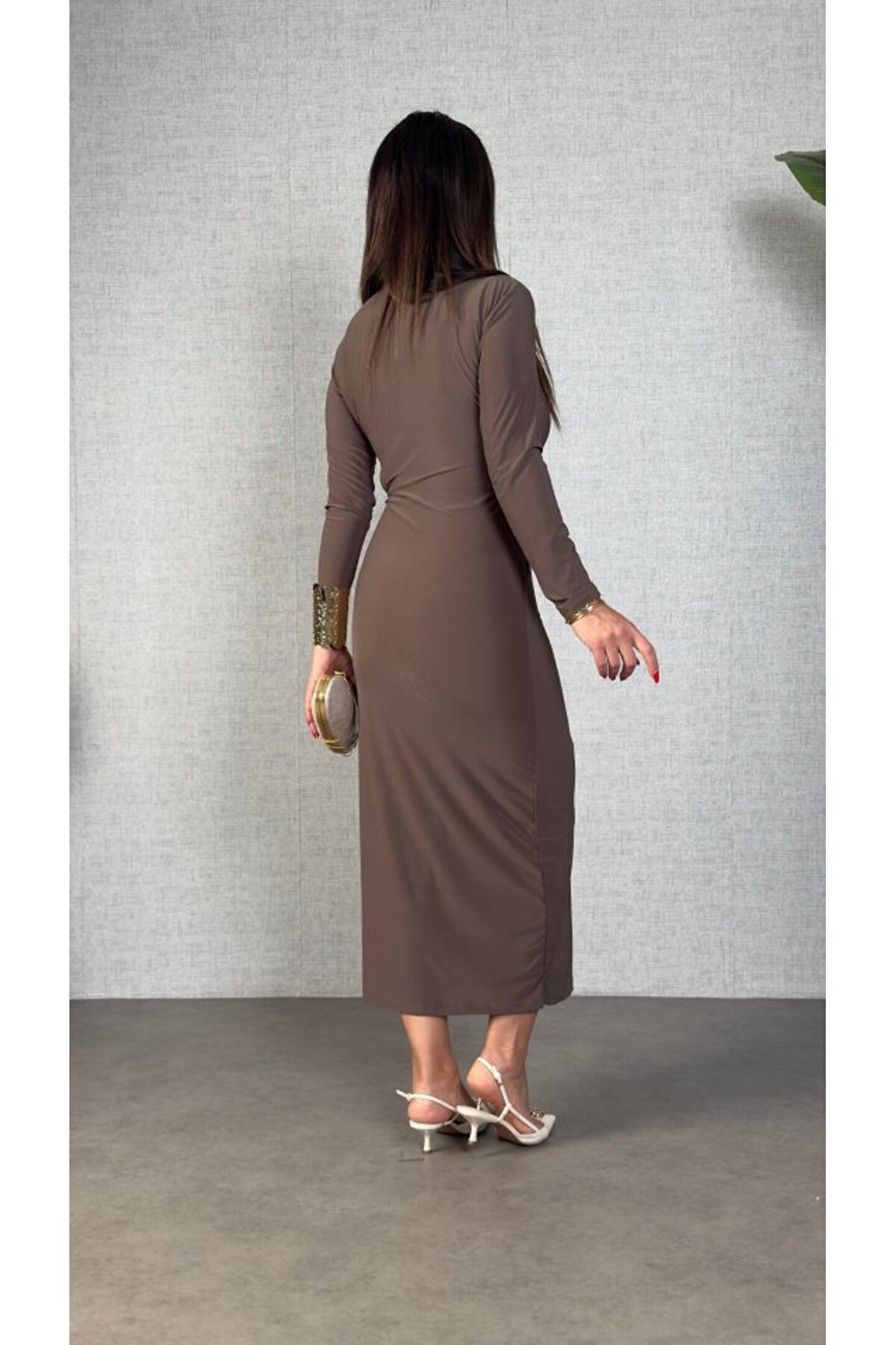 Kadın Balıkçı Yaka Toka Detay Sandy Kumaş Midi Boy Elbise