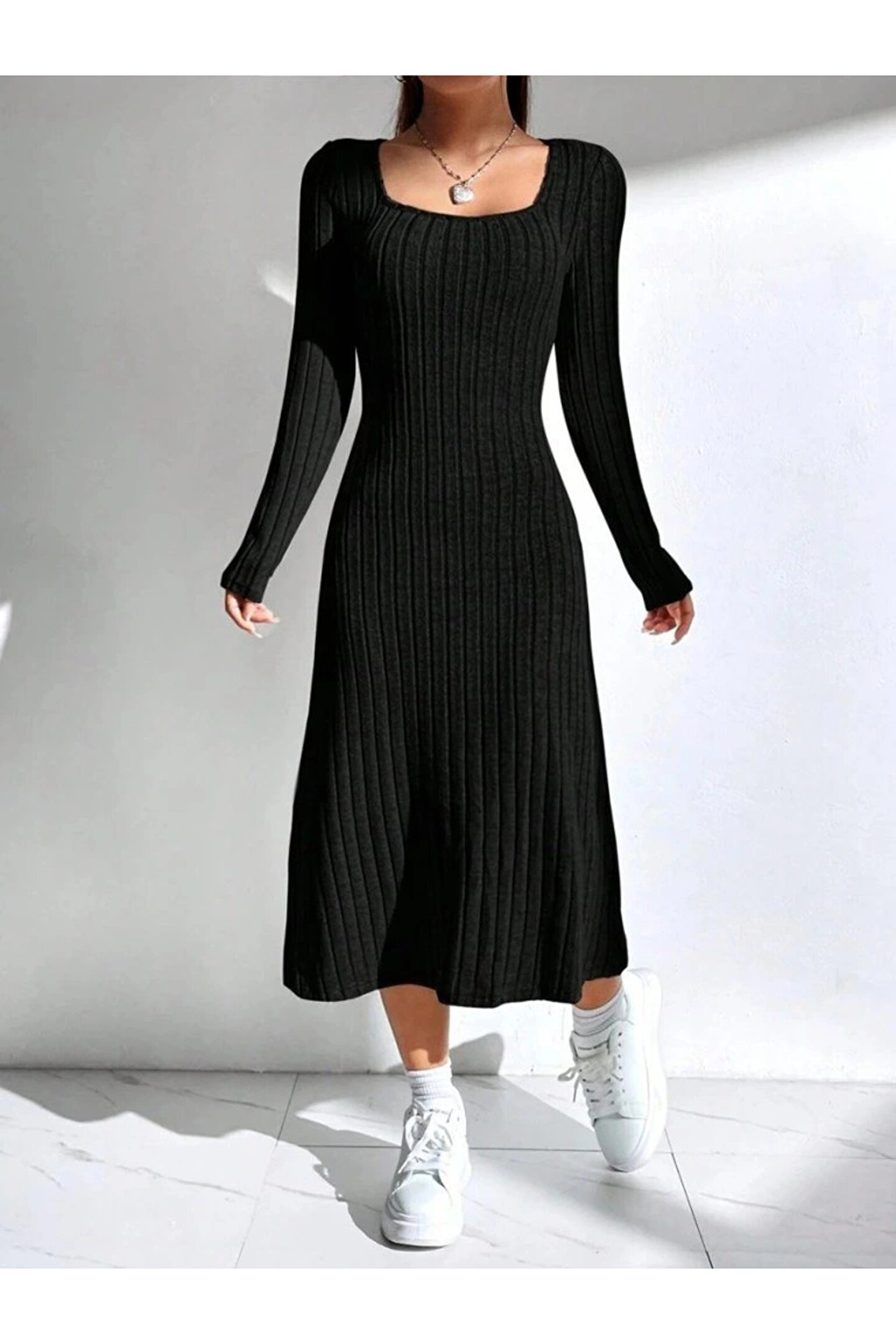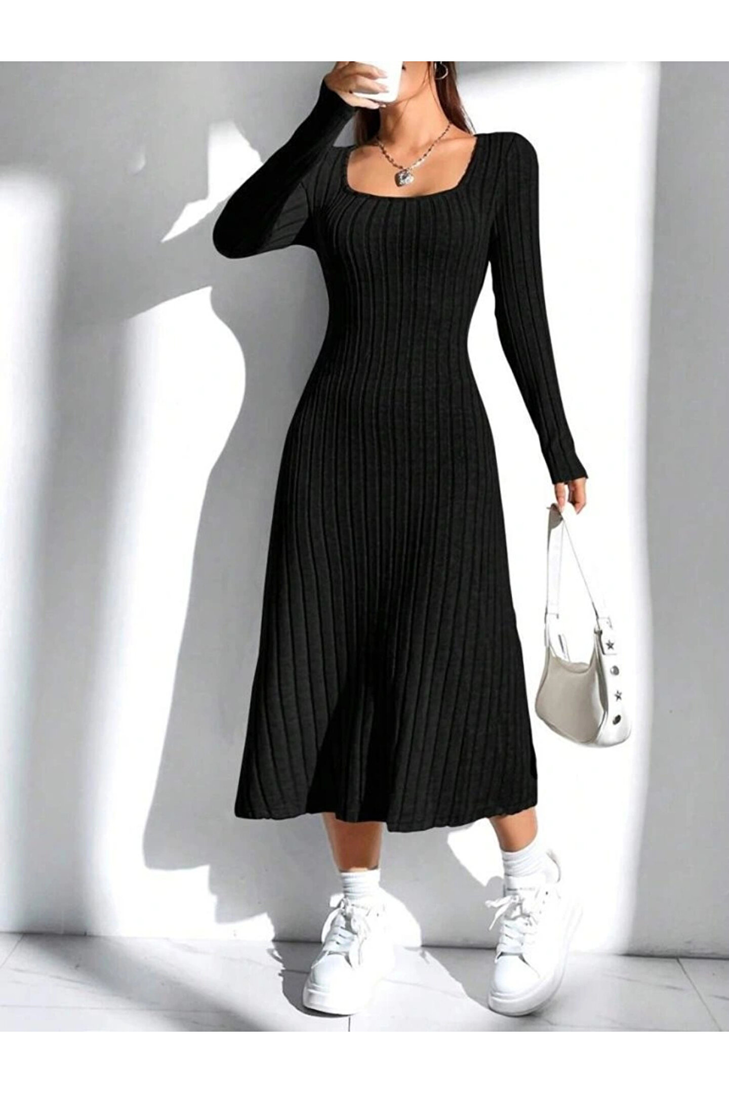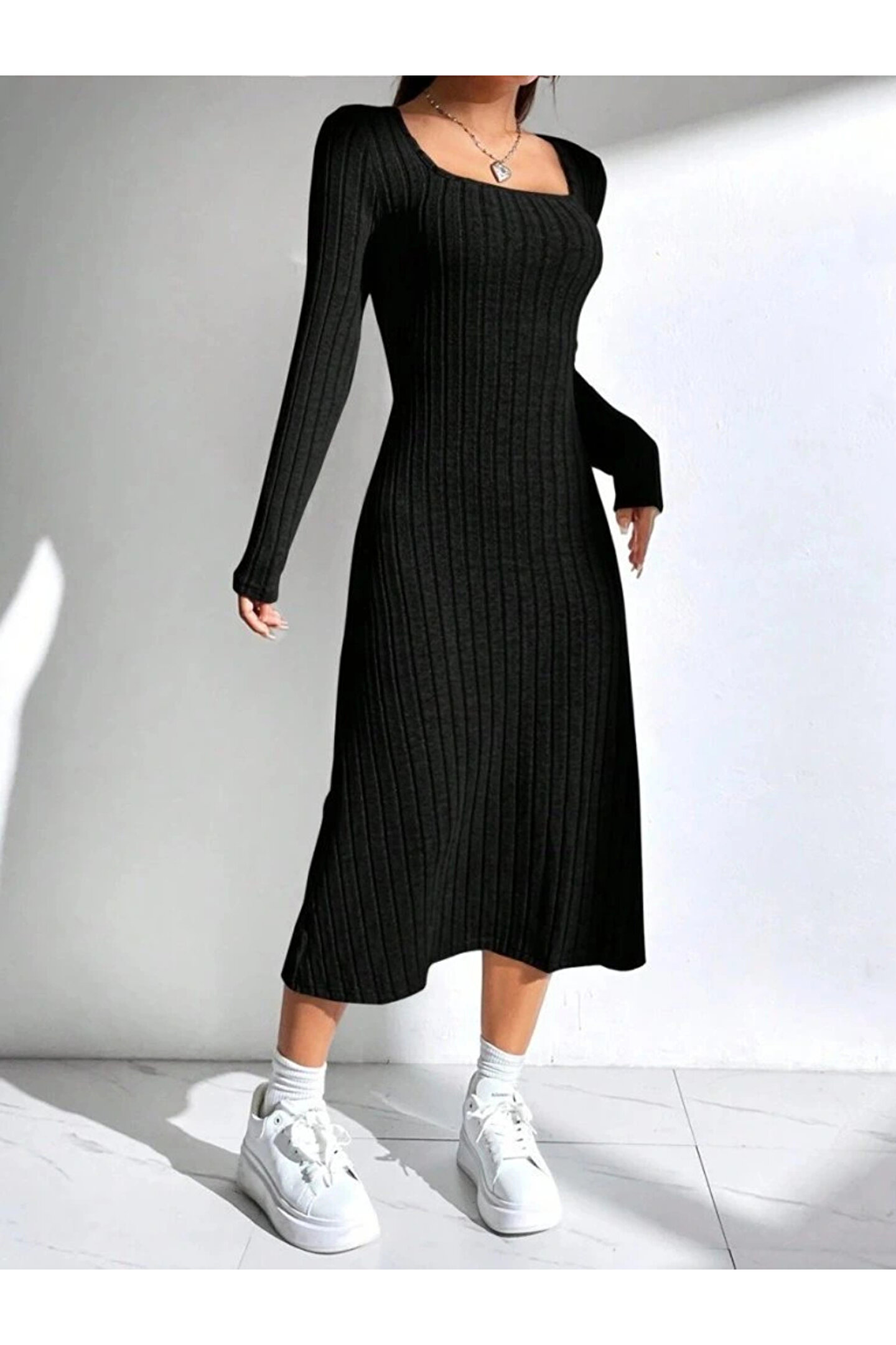 Kadın Uzun Kollu Kare Yaka Midi Kaşkorse Elbise