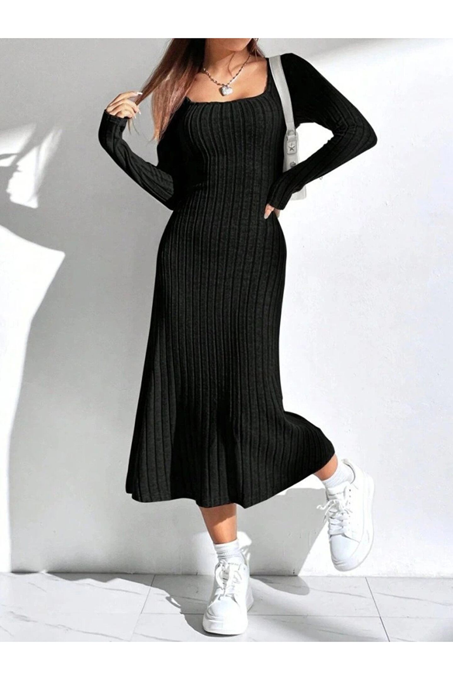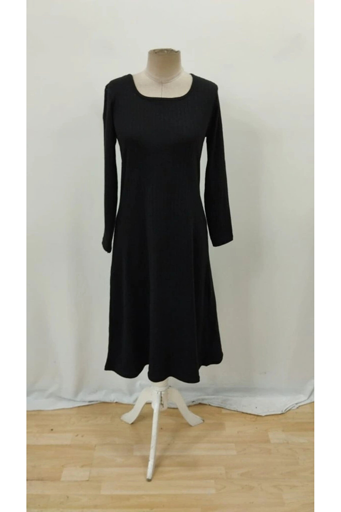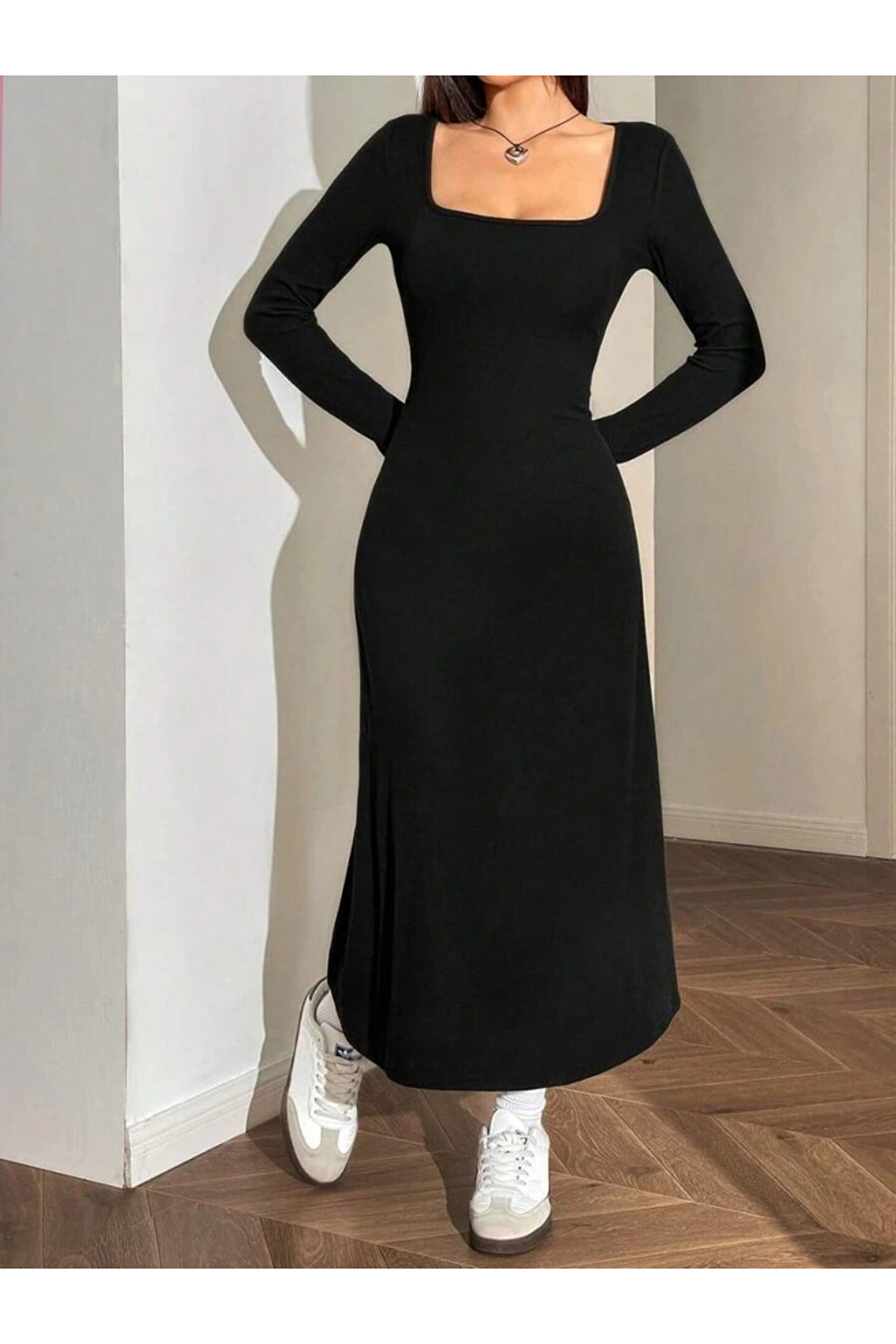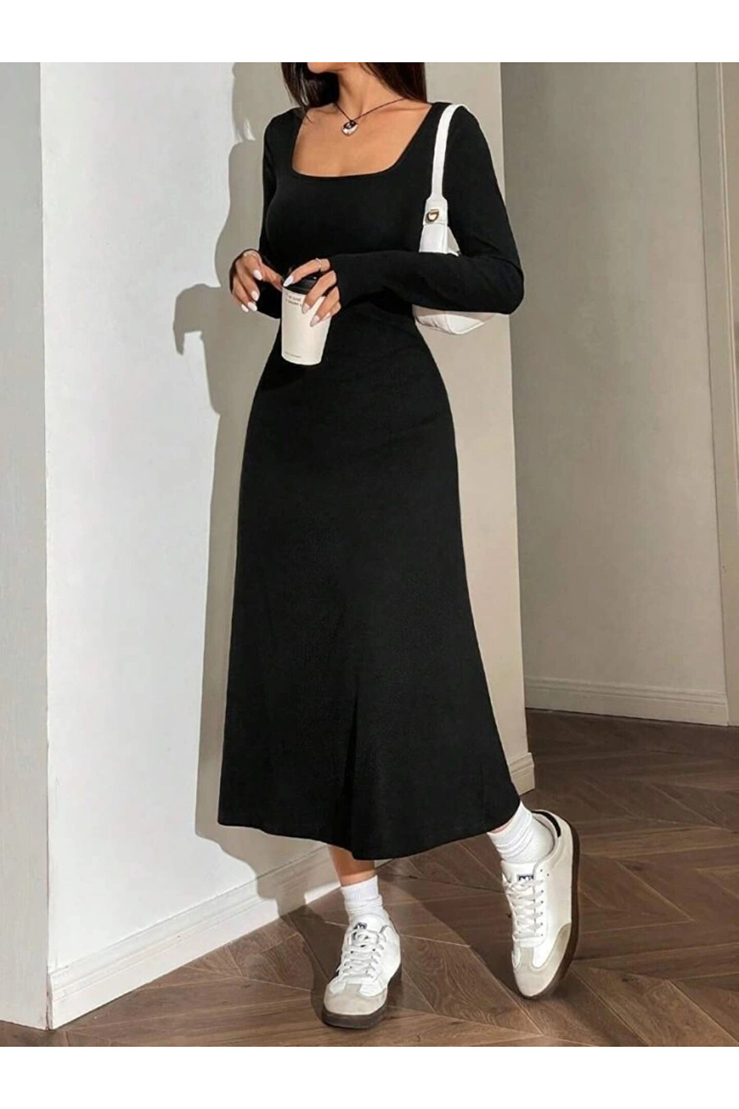Kadın Uzun Kollu Kare Yaka Midi Kaşkorse Elbise