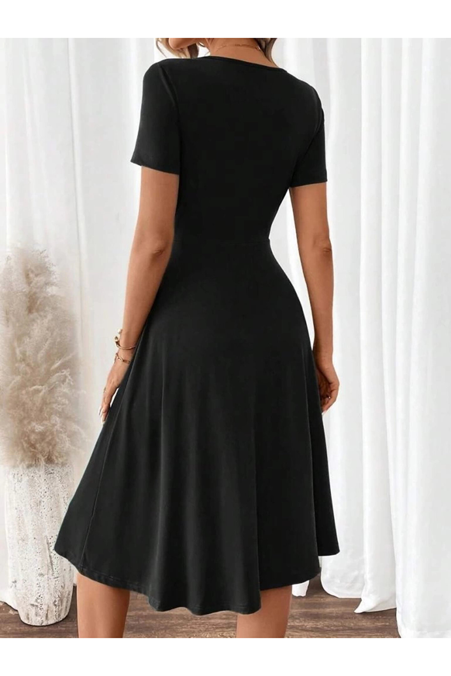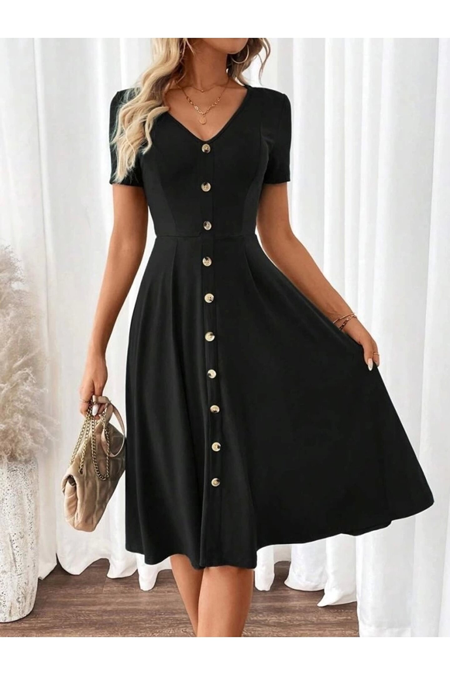 Kadın Kısa Kollu V Yakalı önden Düğmeli A Kesim Dokuma Elbise