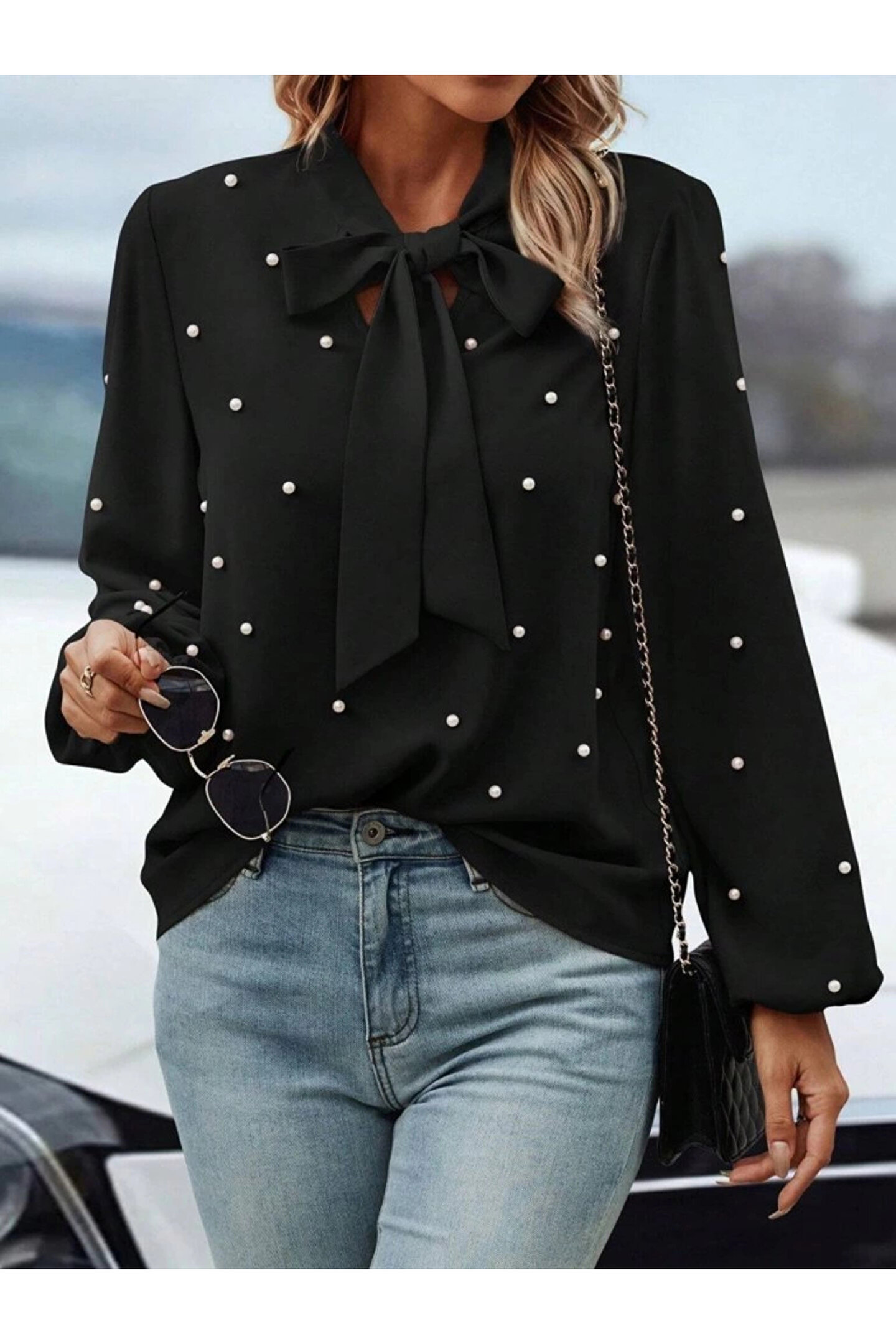 Kadın Uzun Kollu Yakadan Fiyonklu Incili Ithal Krep Bluz