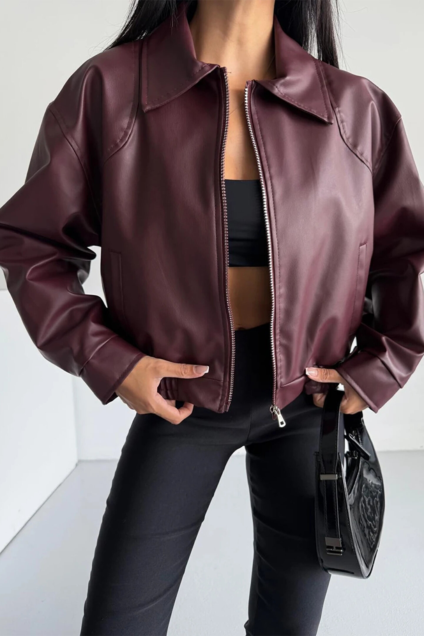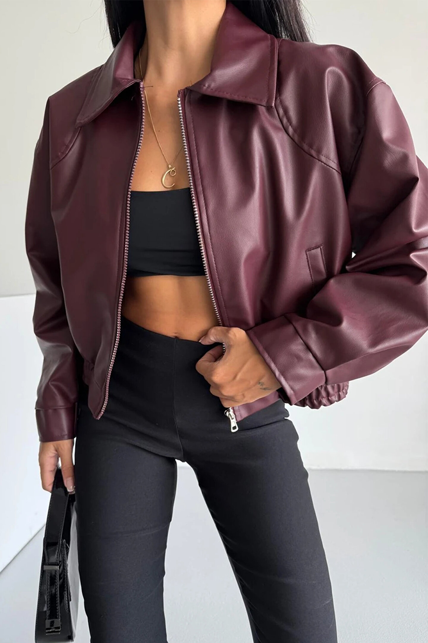 - Şık ve modern bir görünüm için siyah renkli, düz desenli suni deri bomber ceket.; - Uzun kollu tasarımı ile mevsim geçişlerinde ve serin havalarda konforlu bir kullanım sunar.; - Gömlek yaka detayı ile klasik ve zamansız bir stil yaratır.; - Çift cepli yapısı sayesinde günlük eşyalarınız için pratik saklama alanları sağlar.; - Casual ortamlarda rahatlıkla tercih edebileceğiniz, günlük kullanım için idealdir.; - Su itici özelliği ile yağmurlu havalarda bile kuru kalmanızı sağlar.; - Fermuarlı kapama şekli kolay giyilip çıkarılabilirlik sunarken şıklığı da korur.; - Tüm sezonlar boyunca rahatlıkla giyilebilecek orta kalınlıkta kumaşa sahiptir.; - Lastikli bel tasarımı sayesinde vücut hatlarınıza mükemmel uyum sağlar ve rahat bir oturuş sunar.; - Yetişkin kadınlar için özel olarak tasarlanmış, cool & comfort persona ile tarzınızı ön plana çıkarır.; - Bomber siluetiyle trend bir görünüm kazandırırken standart boy uzunluğuyla her vücut tipine uyum sağlar.;