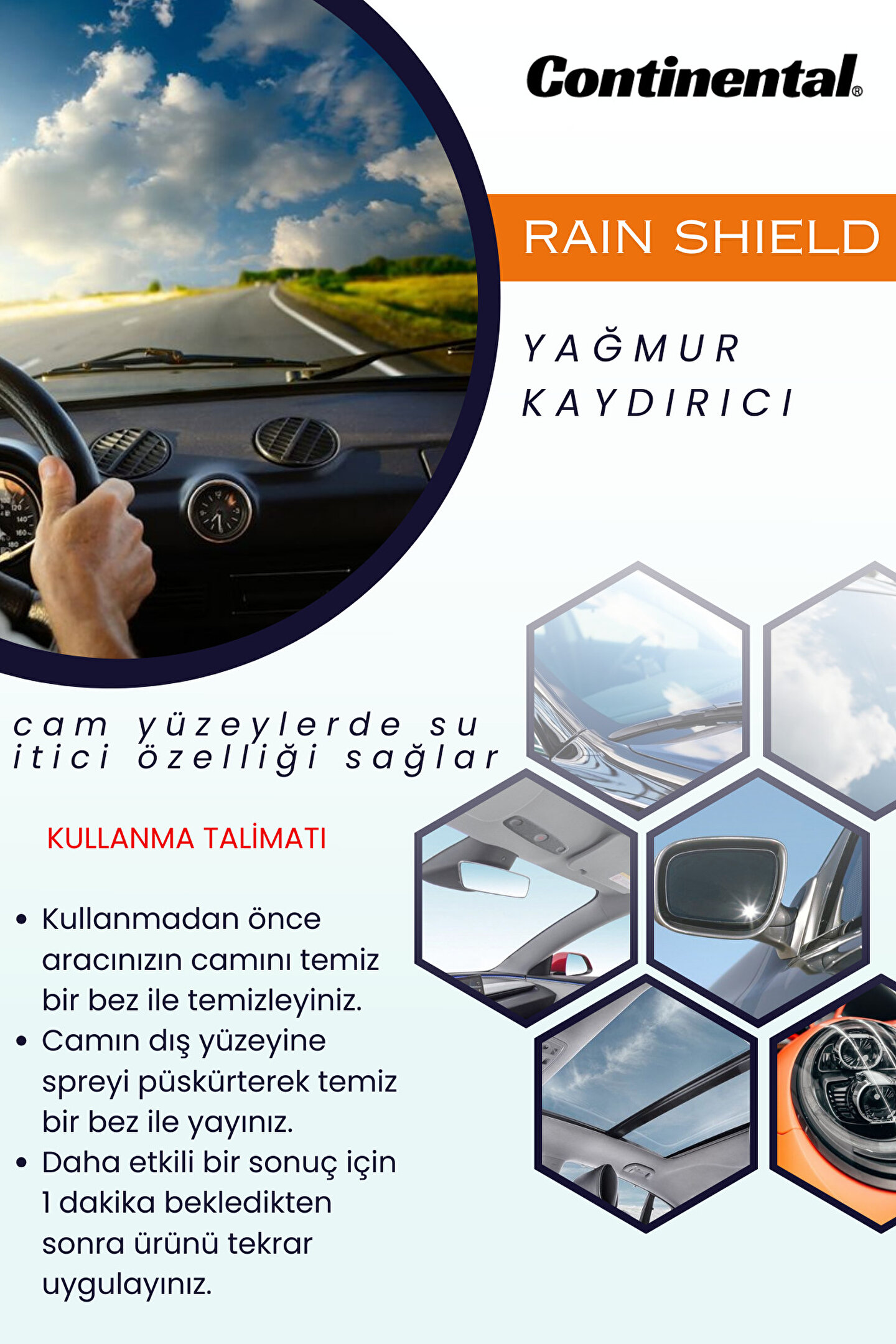 CONTINENTAL raın shıeld yağmur kaydırıcı yağmur damlacıklarının cama tutunmasını zorlaştırır.; Yüzeyde oluşan damlaların rüzgarla kaymasını ve kirlerin yüzeye tutunmasını önleyerek sürüş güvenliğini arttırır.; Uygulandığı yüzeyin üzerini kaplayarak tamamen görünmez bir katman oluşturur ve cam yüzeyin dokusunda, görünüşünde veya renginde hiçbir değişiklik oluşturmaz.; Çamur ve tozların camlara yapışmasını geciktirirken, camların temizlenmesini de kolaylaştırır.; Otomobil camları ve aynaları vb.; suya maruz kalan cam yüzeylerde kullanılabilir.; ; KULLANIMI; Kullanmadan önce camını uygun bir bez ile temizleyiniz.; ; Camın dış yüzeyine CONTINENTAL rain shıeld yağmur kaydırıcı p üskürtme mekanizmasını ON konumu üste gelecek şekilde çeviriniz püskürtünüz ve temiz bir bez ile ürünü yayınız.; İlk kullanımda spreyi en az 3 defa püskürtünüz ; Daha etkili bir sonuç için yaklaşık bir 1 dakika bekledikten sonra işlemi tekrarlayınız.; ; Kullanım sonrasında püskürtme mekanizmasını OFF konumuna getirip şişeyi dik olarak saklayınız.; ; TÜKETİCİNİN DİKKATİNE; Kullanma talimatını mutlaka okuyunuz.; El, yüz, vücut ve gıda maddelerinin temizliğinde kullanmayınız.; Çocukların erişemeyeceği yerde saklayınız.; Gıda maddelerinden uzakta bulundurunuz.; Alerjik reaksiyonlara neden olabilir.