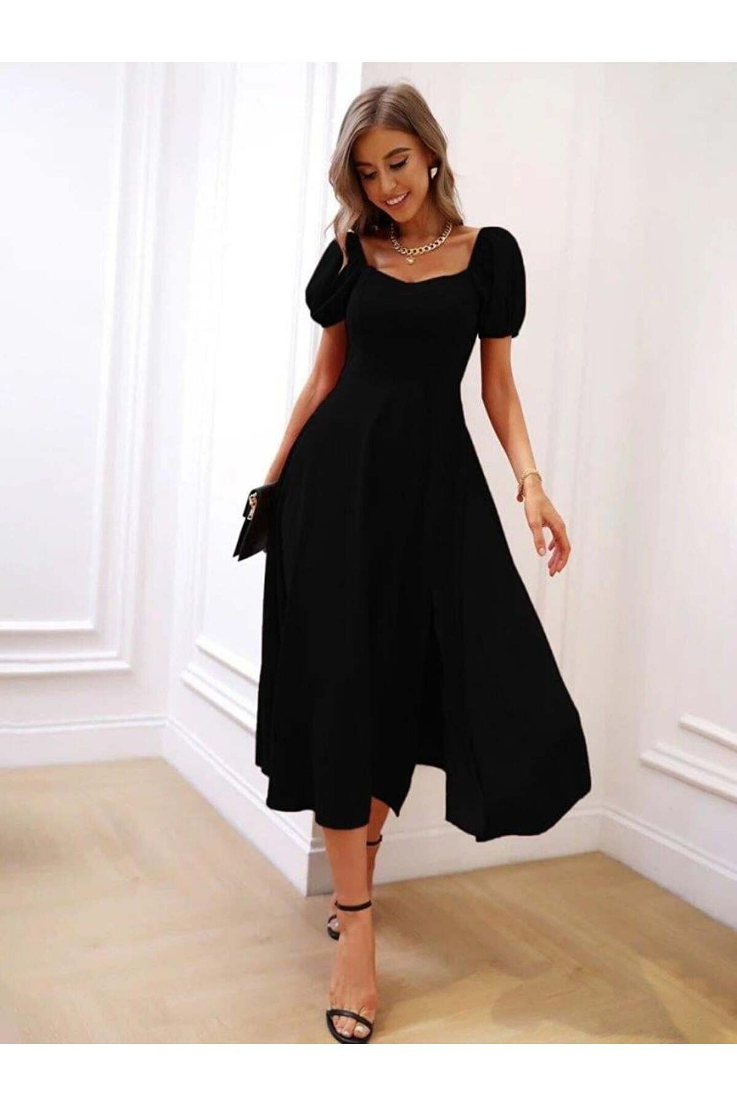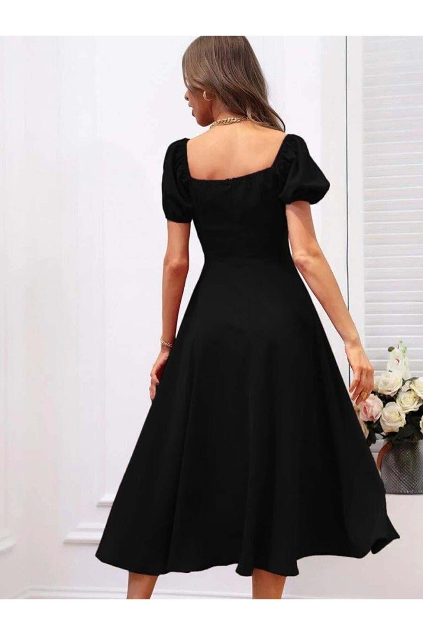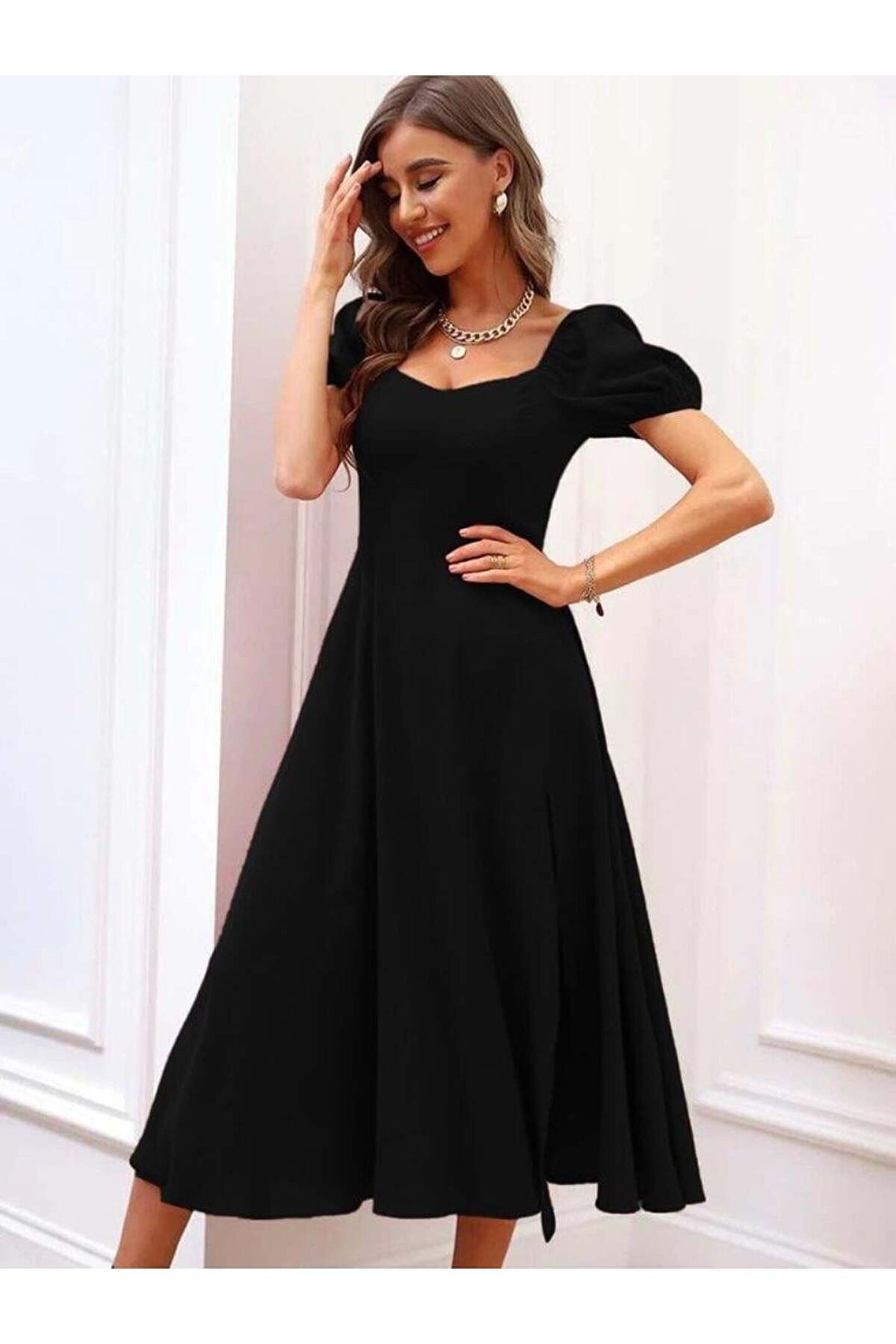 Kadın Kısa Kollu Kare Yakalı Yırtmaçlı Midi Janjan Krep Elbise