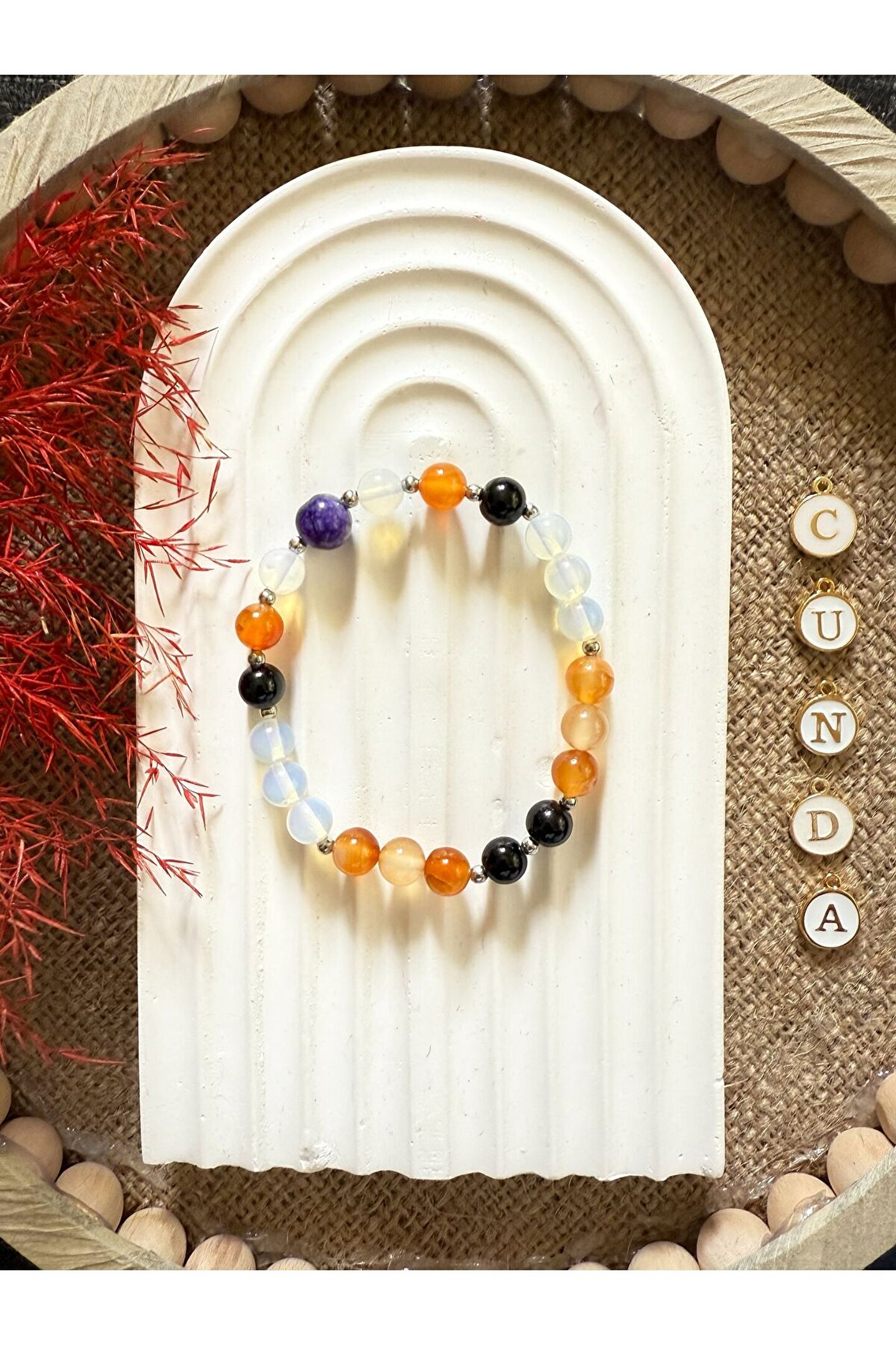- oval kesim doğal taşlar, zarif ve şık bir görünüm sunar.; - Her bileklik, kişiye özel olumlama özelliğiyle enerji ve pozitiflik katmak için tasarlanmıştır.; - Doğal taş kullanımı, her bilekliğin benzersiz ve otantik bir dokunuş kazanmasını sağlar.; - Nemli bir bezle kolayca temizlenebilen yapısı sayesinde bakımı pratiktir.; - Türkiye'de üretilen bu bileklikler, yerel işçiliğin ve zanaatkarlığın bir yansımasıdır.; - Kadın ve kızlar için uygun olan bu bileklik, her yaş grubuna hitap eder.;