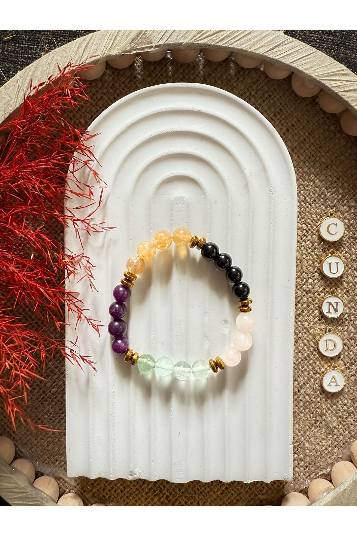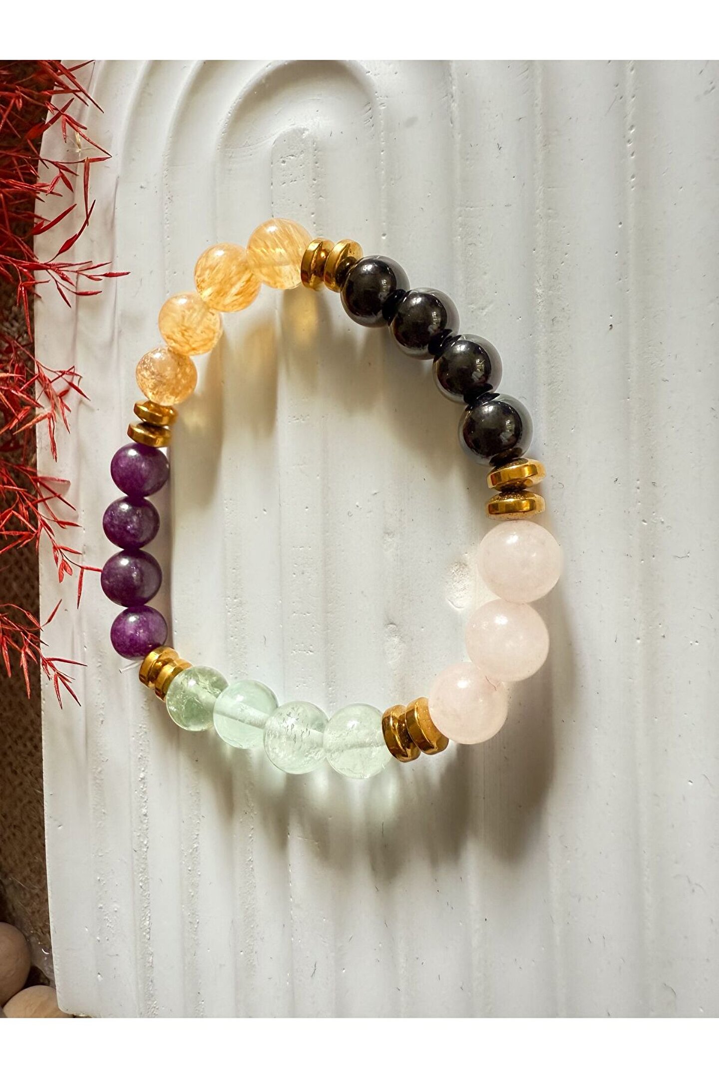 - Oval kesim florit, ametist, sitrin, oniks, pembe kuvars ve hematit taşları ile zenginleştirilmiş, her biri doğal güzellikleriyle göz kamaştıran bir bileklik.; - Doğal taşların eşsiz desenleri ve renkleri, her bilekliğe benzersiz bir karakter kazandırır.; - Nemli bir bezle kolayca temizlenebilir yapısı sayesinde bilekliğinizin ilk günkü parlaklığını korumasına yardımcı olur.; - Türkiye'de üretilmiş olup, yerel işçilik ve doğal kaynakların bir araya gelmesiyle oluşturulmuştur.; - Kadın ve kızlar için ideal bir aksesuar seçeneği olarak öne çıkar; yetişkin yaş grubuna hitap eder.;