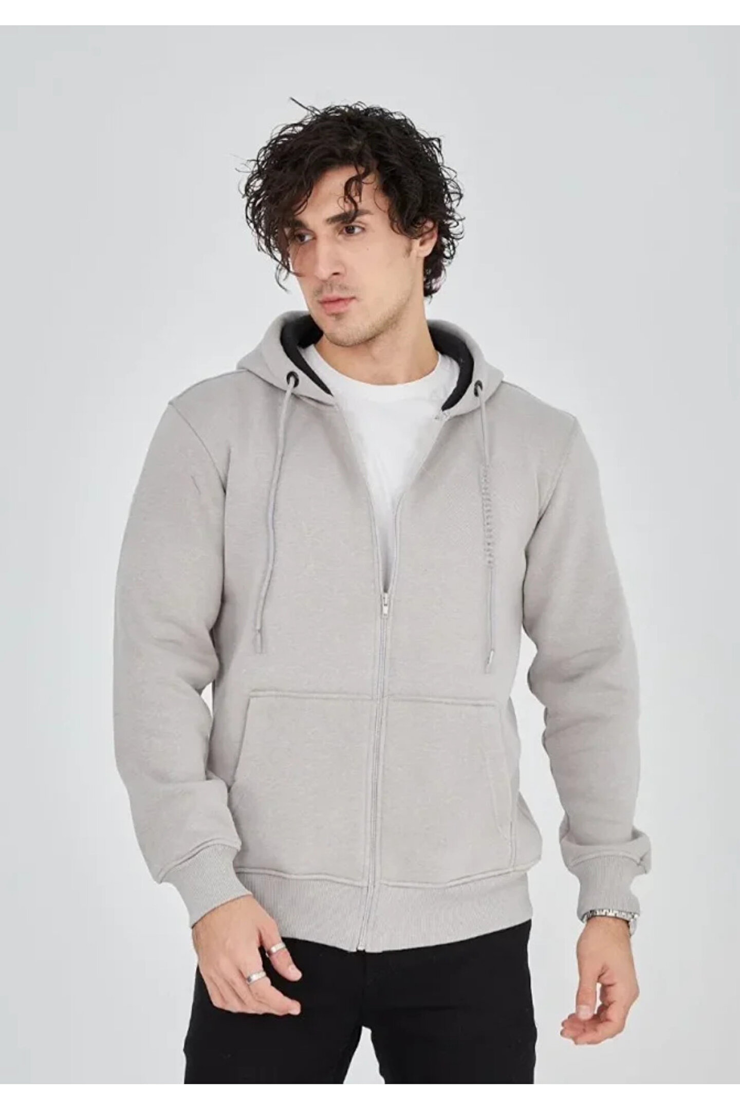 Unisex Tam Fermuarlı Kapşonlu SweatShirt - Boyalı Gri