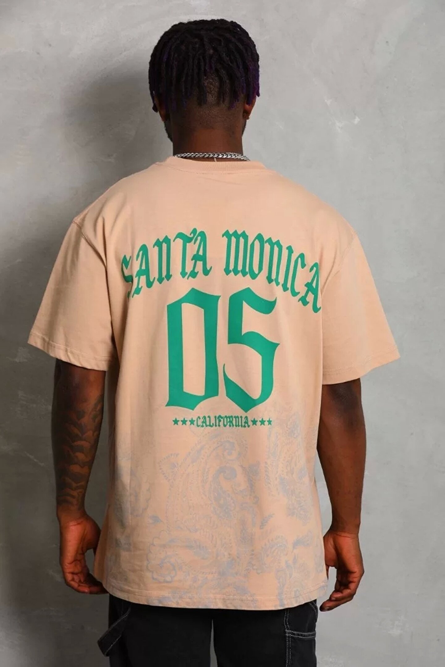 Unisex Oversize Baskılı Bisiklet Yaka T-Shirt - Bej