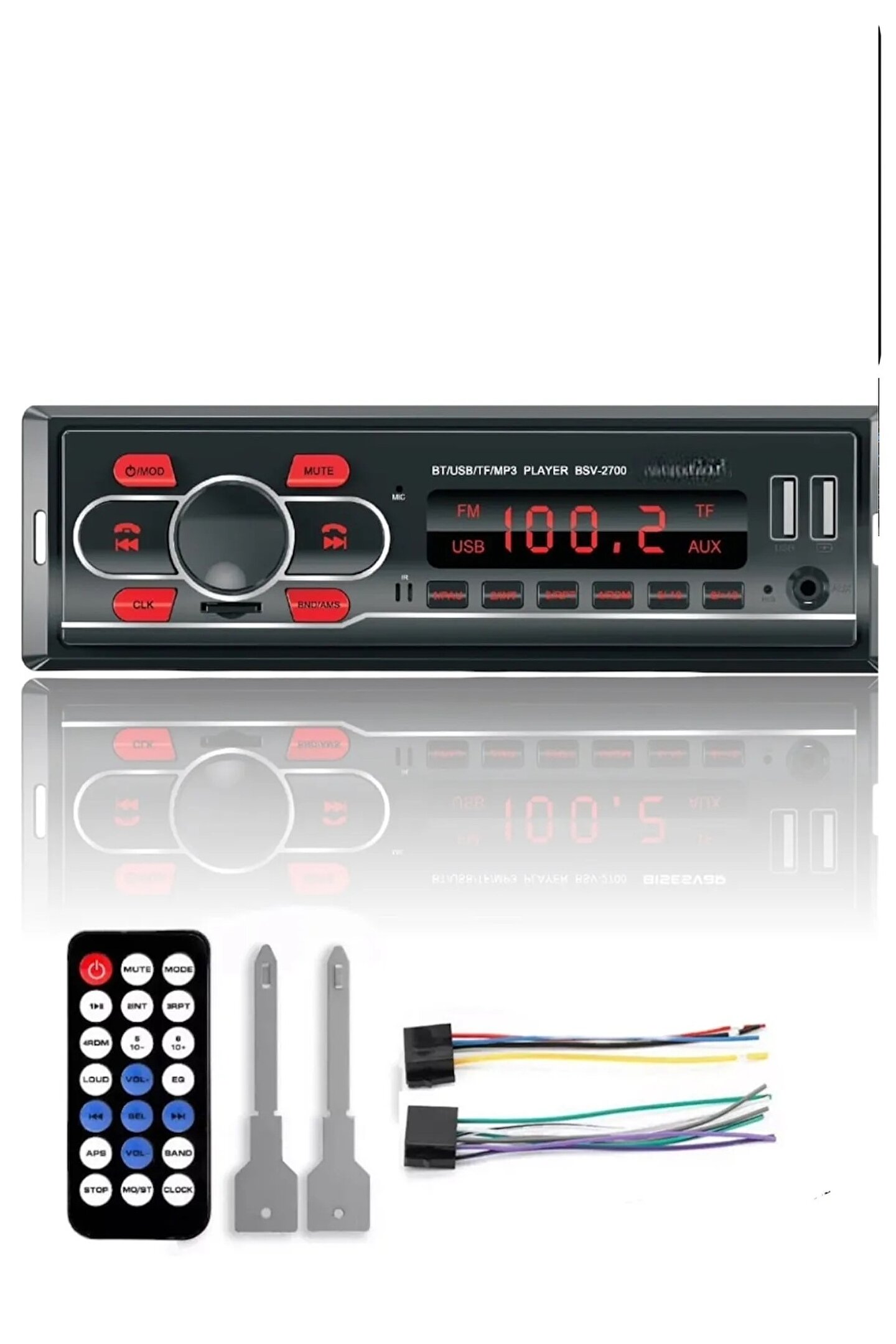 Ürün özellikleri: ; Dahili Bluetooth + mikrofon. Eller serbest aramalar Dijital yüksek kaliteli FM stereo radyo, Önceden ayarlanmış 18 istasyon (frekans: 87.5-108 MHz) Destek USB/SD/MMC kart okuyucu Destek ses: MP3/WMA/WAV, vb. Destek uzaktan kumanda Döner ses kontrolü MP3 randomize, 10 parça yukarı/aşağı oynatma Elektronik kontrol ses tiz, bas, denge ve fader Çoklu EQ sahne seçimi: caz, kaya, pop, klasik, vb. Sessiz ve Loudess kontrol L/R RCA ses çıkış jakları 4 kanallı 4X50 WATT yüksek güç çıkışı (4 hoparlör) ÜRÜN boyutu: 180mm (W) * 50 MM (H) *80MM ; Uyarı : Lütfen ürünün bağlantısını yetkili / deneyimli oto elektrikçilerde kutu içerisinde ki orijinal soketleri ile yaptırınız. Kendi bilginize dayanarak yaptığınız bağlantılarda oluşabilecek yanlışlıklar sonucunda ürünü yandırabilir ve garanti dışı bırakabilirsiniz. " bağlantısı yapılan ürünler 2.El statüsüne girdiği için iade cayma hakkı kapsamında değildir ! 2 usb girişi sayesinde cep telefon şarj etme ve mp3 player özelliği bluetooth, usb, aux, sd kart, bluetooth özelliği sayesinde telefona bağlanabilme, handsfree görüşme ve müzik dinleme display özelliği ile sorunsuz gösterge usb sd kart ile müzik dinleme aux kablo ile bağlantı uzaktan kumandası ile her şey kontrol altında güçlü radyo fm desteği 4x50 watt çıkış ile yüksek seste kaliteli şık tasarımlı ön panel 6 ay cassa messa firması tarafınadan garntilidir ;