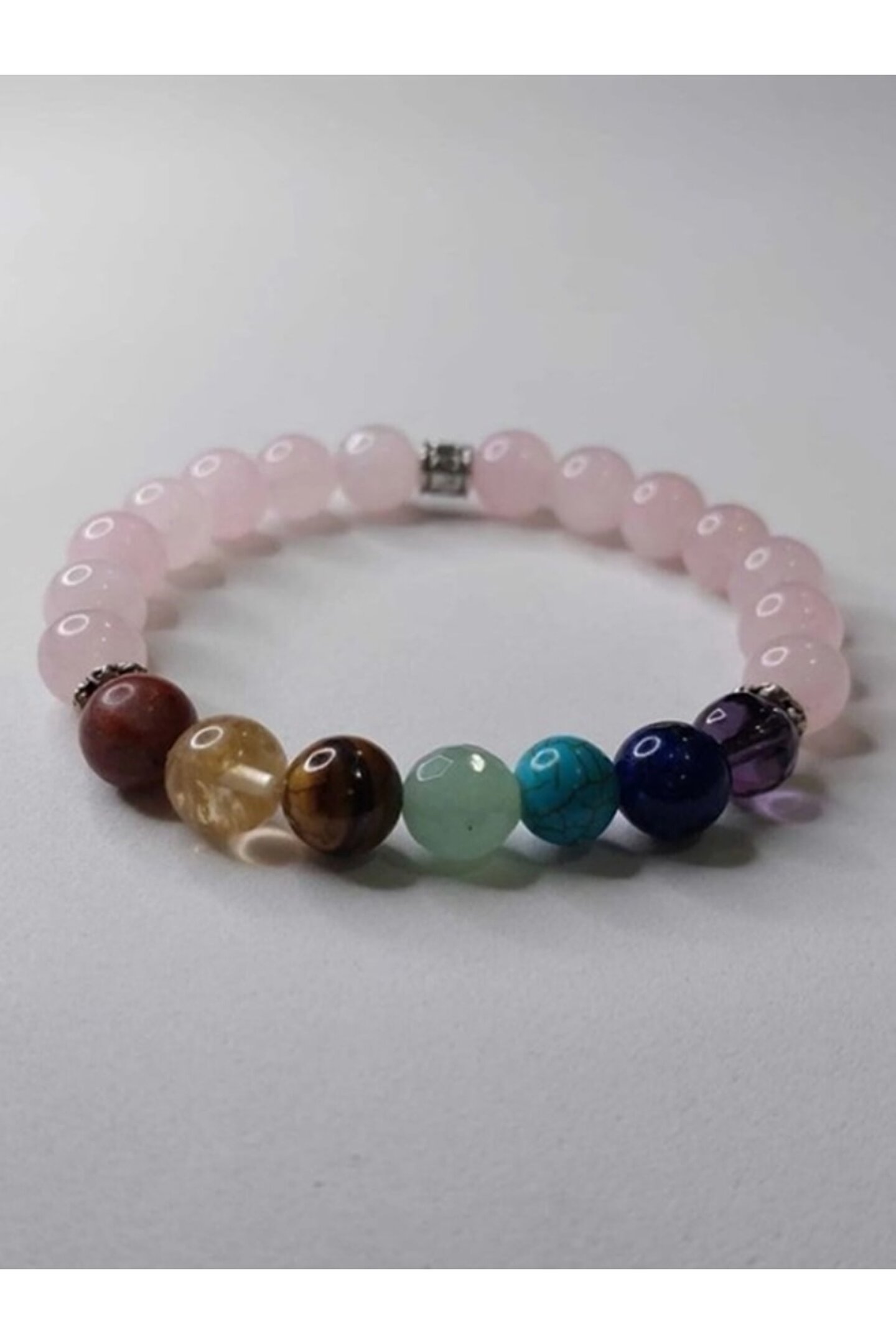 Özel tasarım 7 çakra unisex bilekliği orjinal doğal taşlardan hazırlanmaktadır. Taşların boyutu 8mm. Standart boylardadır. ; Bedenimizdeki 7 çakra da yaşam enerjimiz sürekli bir akıştadır. Çakralardaki dengesizlik, tıkanıklık, fiziksel ve ruhsal olarak hastalıklara sebep olur. Ruhsal gelişimde çakralardaki enerji akışını sağlıklı olmasıyla bağlantılıdır. Çakra taşları çakraların dengelenmesi, tıkanıklıkların açılması için gereken enerjiyi verir. Her taşın farklı frekansı vardır ve kullandığımız sürece bize gereken şifayı aktarır. ; Taşlarınızın arındırılması için haftada bir kez akan suda 5dk. Suda bekleterek, tütsüleyerek veya bir gece toprak üstünde bekleterek enerjilerini dengeleyip temizleyebilirsiniz. ;