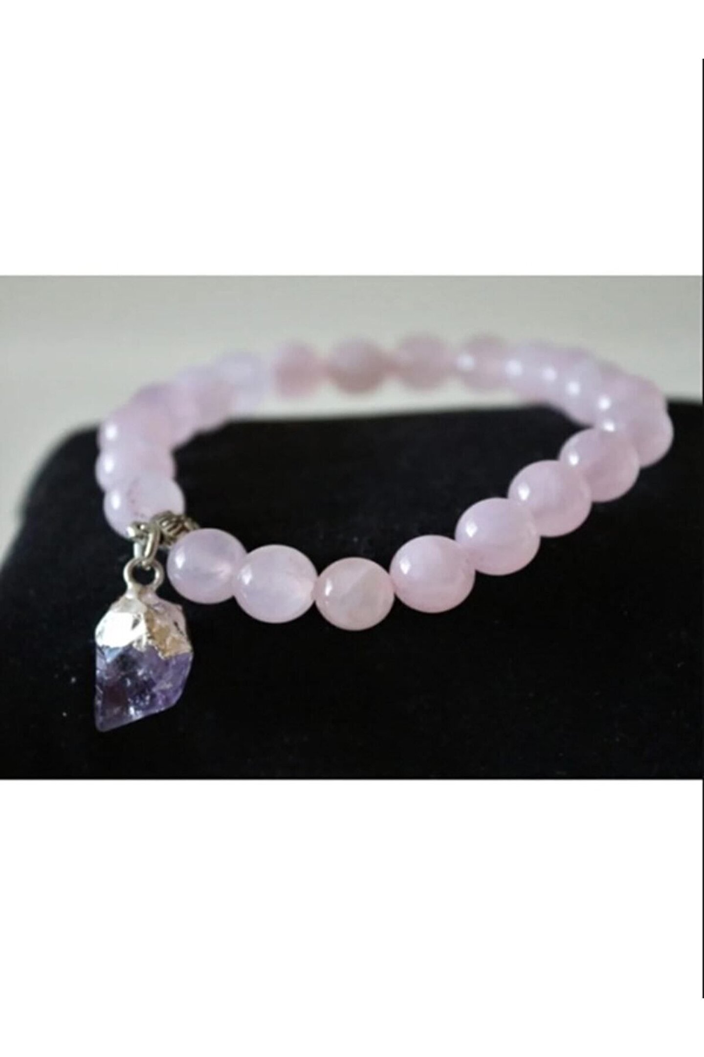 Pembe kuvars taşı, kalbi hastalık ve travmalara karşı korur. Mutluluk duygusu verir. Ametist ile uyumlu kullanıldığı zaman bir şekilde enerjiyi arttırır ve aşk duygusunu güçlendirir. ; Burçları koç, boğa, ikizler, yengeç, başak, ; Uyumlu olduğu çakra boğaz çakrası ve 4. Kalp çakrası ; Elastik yapıda olduğu için yetişkin kadın ve erkekler için uygundur, bu üründe kullanılan işlenmemiş ametist taşı şekli küçük farklılıklar gösterebilir bu üründe kullanılan doğal taş: Pembe kuvars taşı, ametist taşı bu üründe kullanılan doğal taş boyutu: Ortalama çap : 8 mm ;