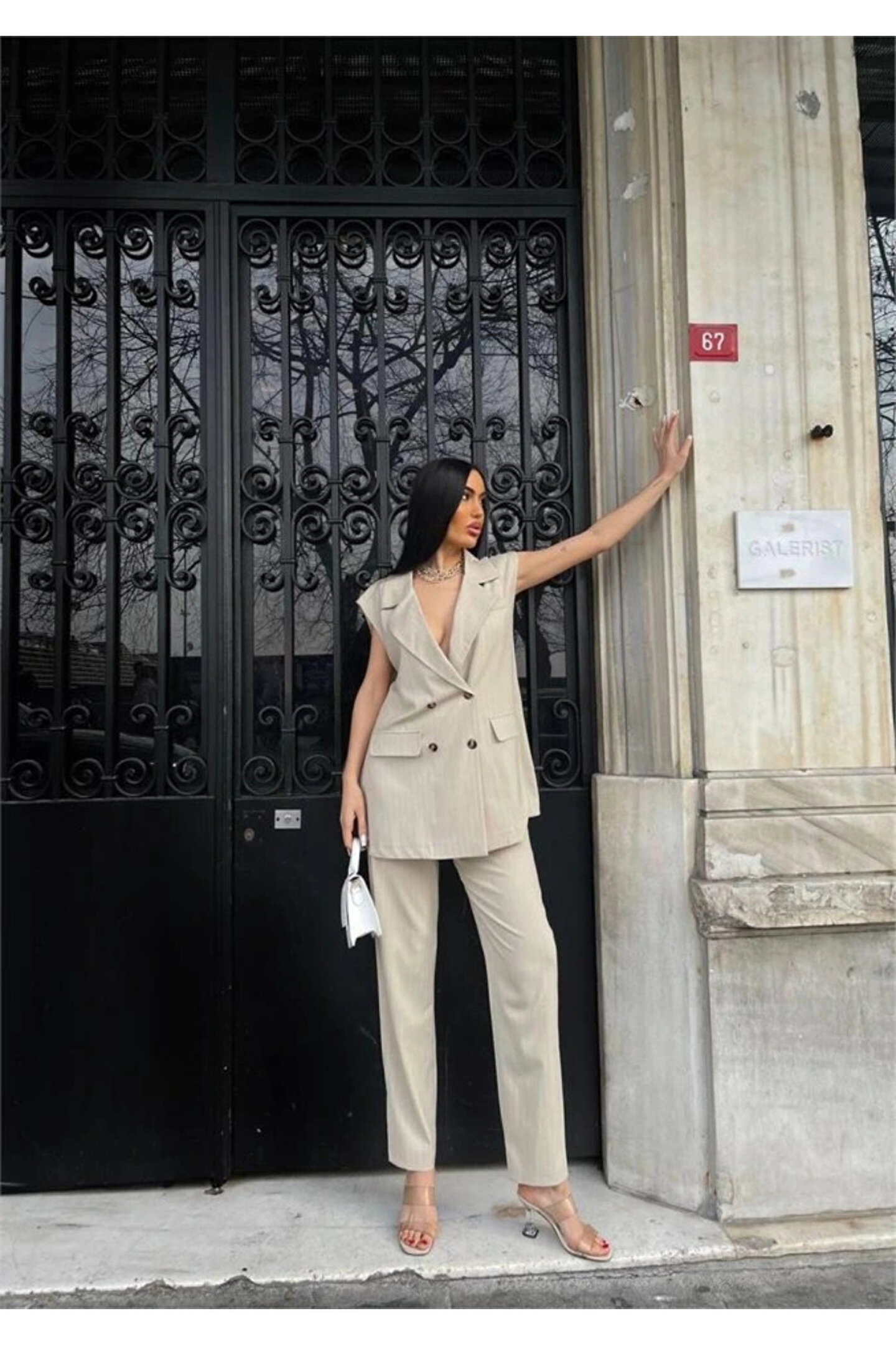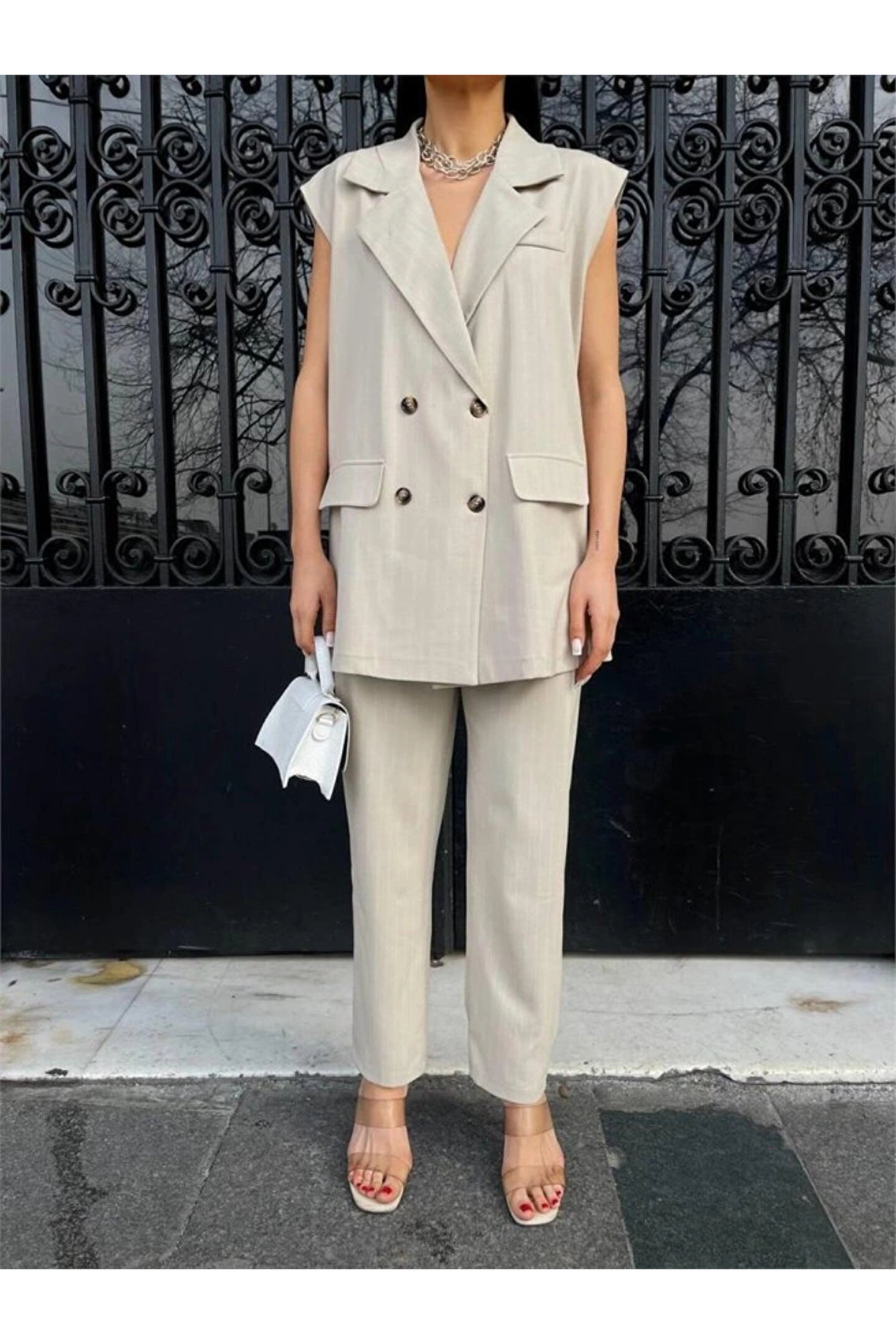 ÇİZGİLİ UZUN YELEK - PANTOLON TAKIM POLVİSCON - Bej