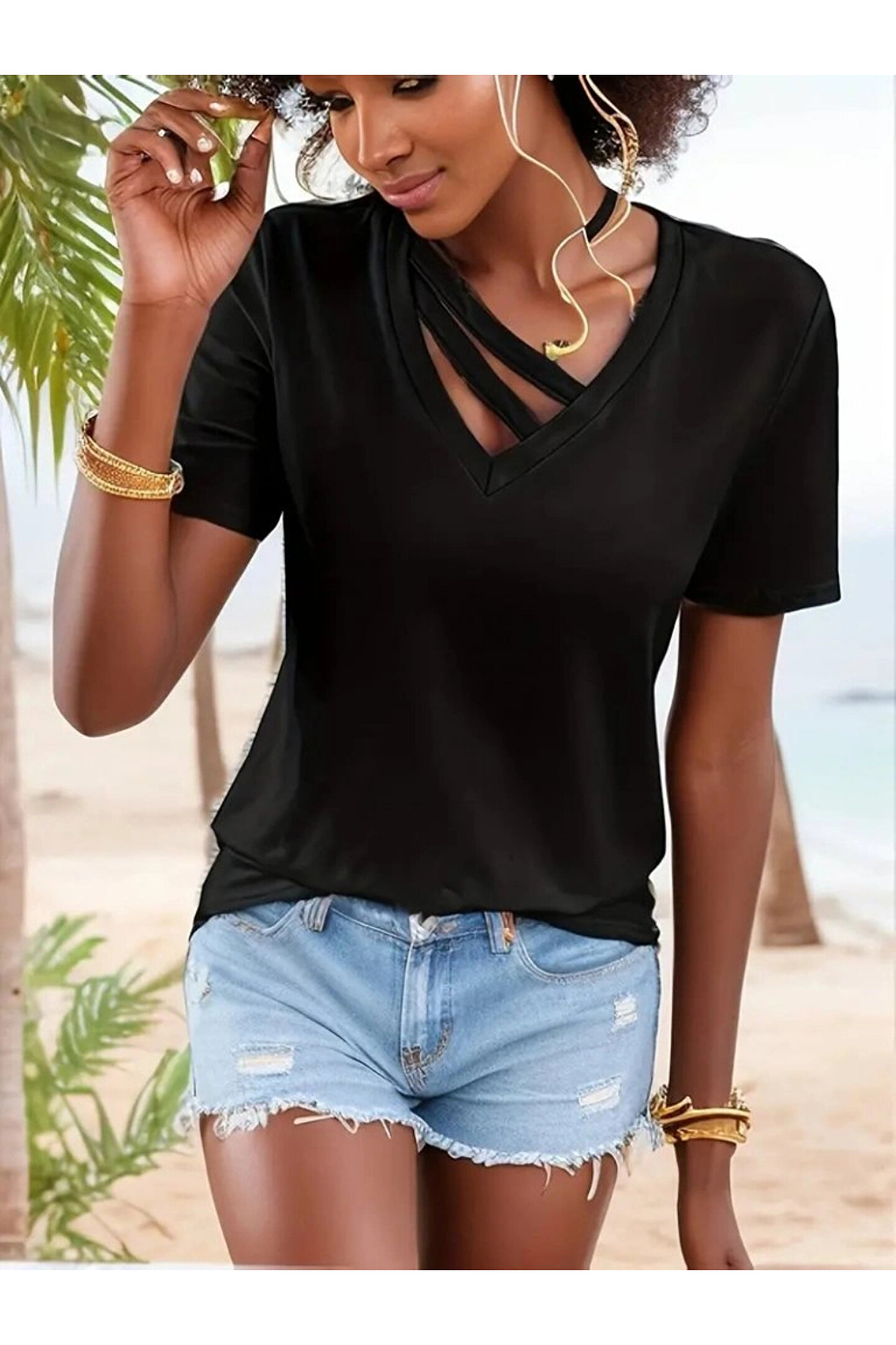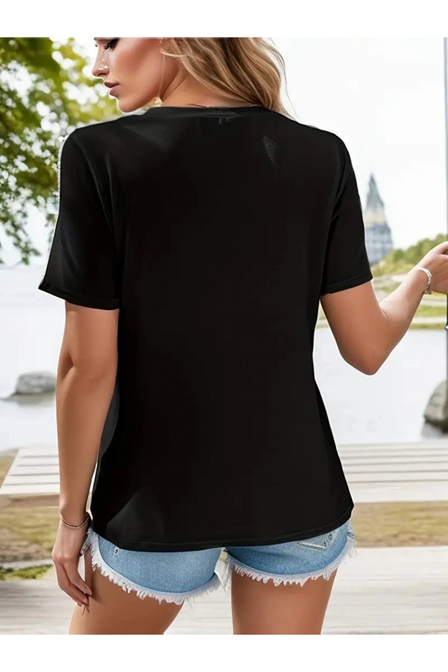 Kadın Kısa Kollu V Yaka şerit Detay Viskon Bluz