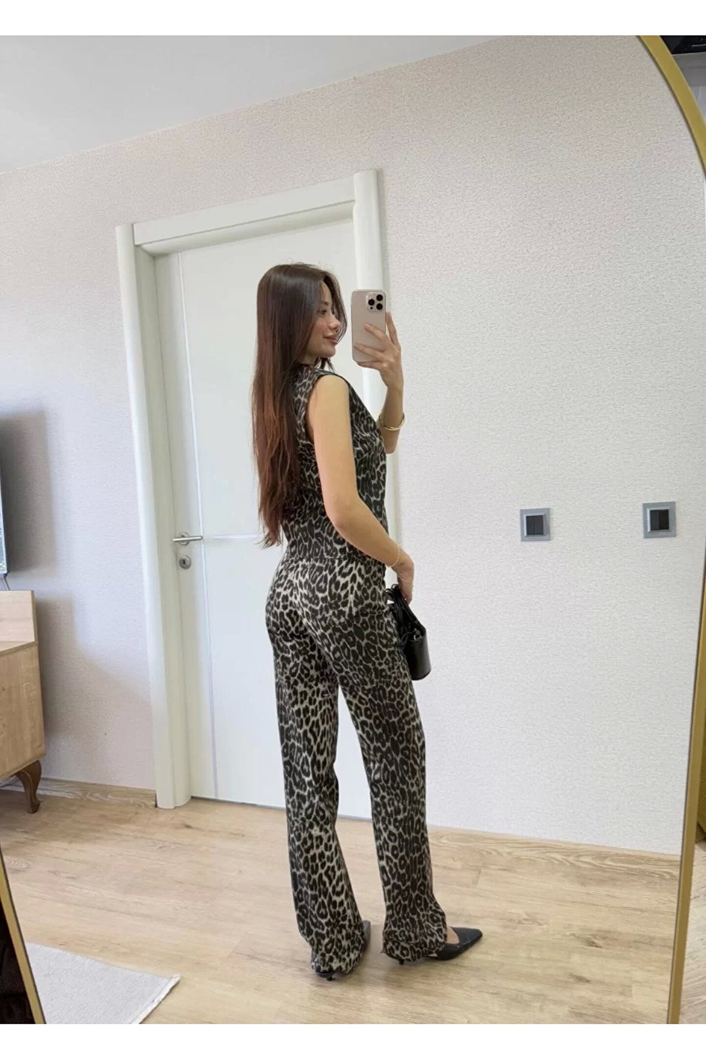 Leopar Desenli Düğmeli Bluzlu Pantolon İkili Takım -Leopar