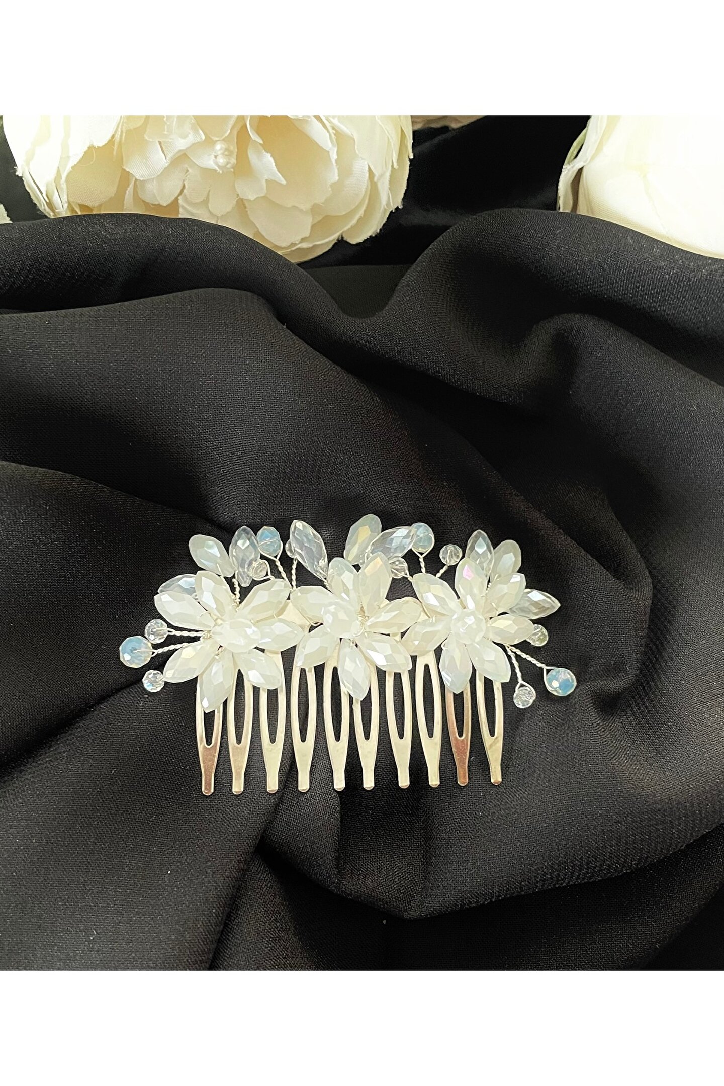 Kristal taş detaylarıyla süslenmiş, zarif tasarımıyla göz alıcı bir görünüm sunar; Beyaz damla taş kullanımı, taç aksesuarına sofistike bir parlaklık katar; Nişan ve gelinlik gibi özel günlerde şıklığınızı tamamlayacak ideal bir aksesuardır; Taraklı yapısı sayesinde saçınıza kolayca takılabilir ve sabit kalır;