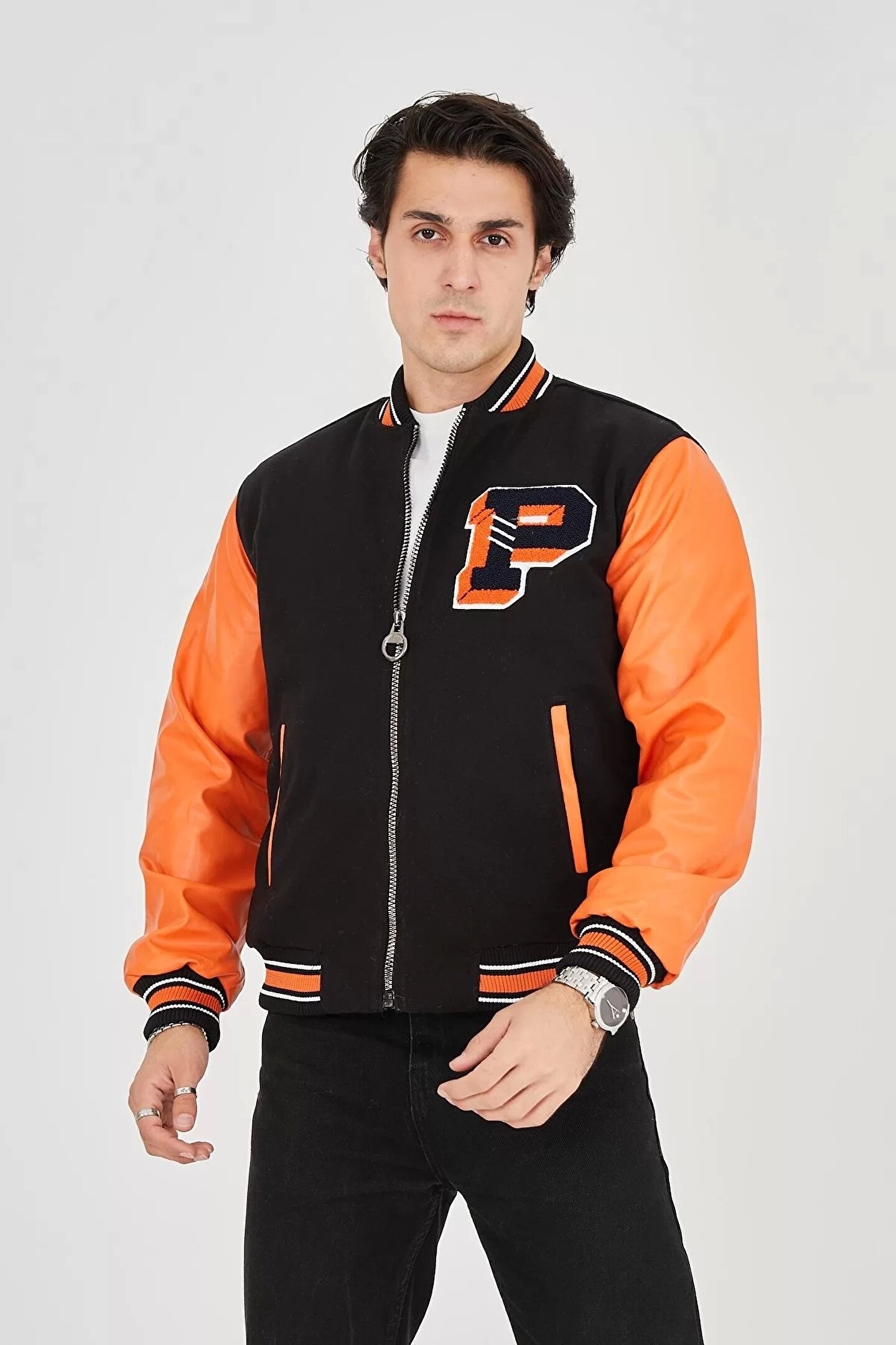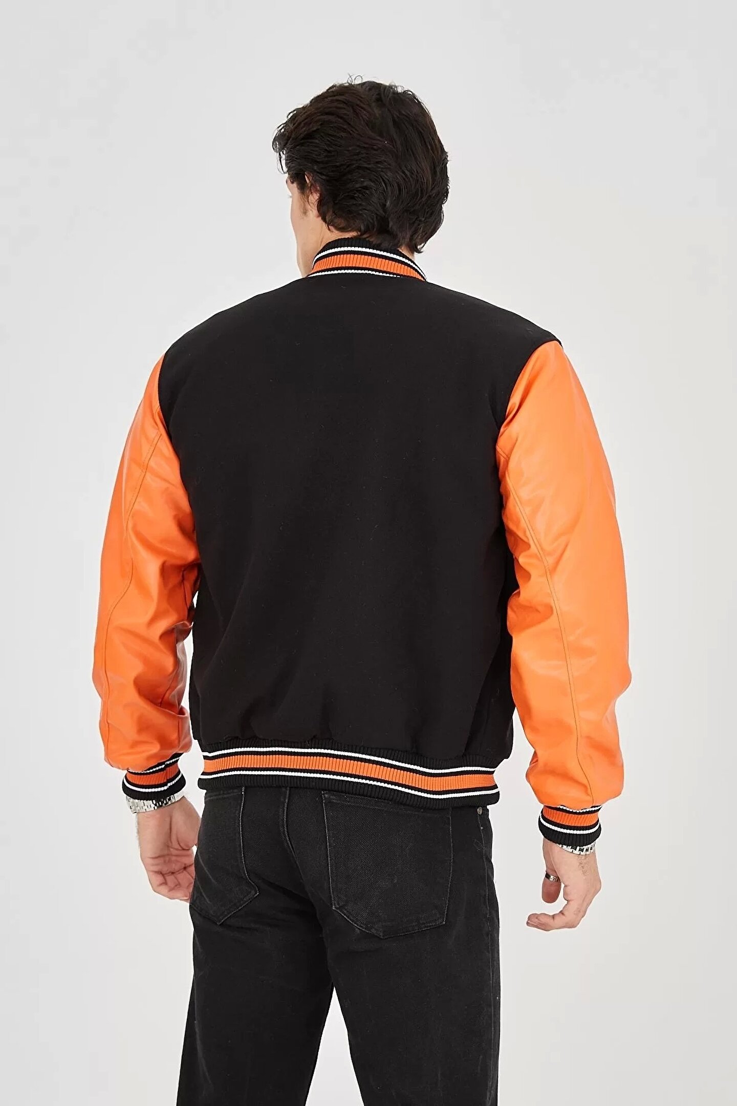 Erkek İçten Elyaf Ve Astarlı Kolları Suni Deri Ceket - Turuncu