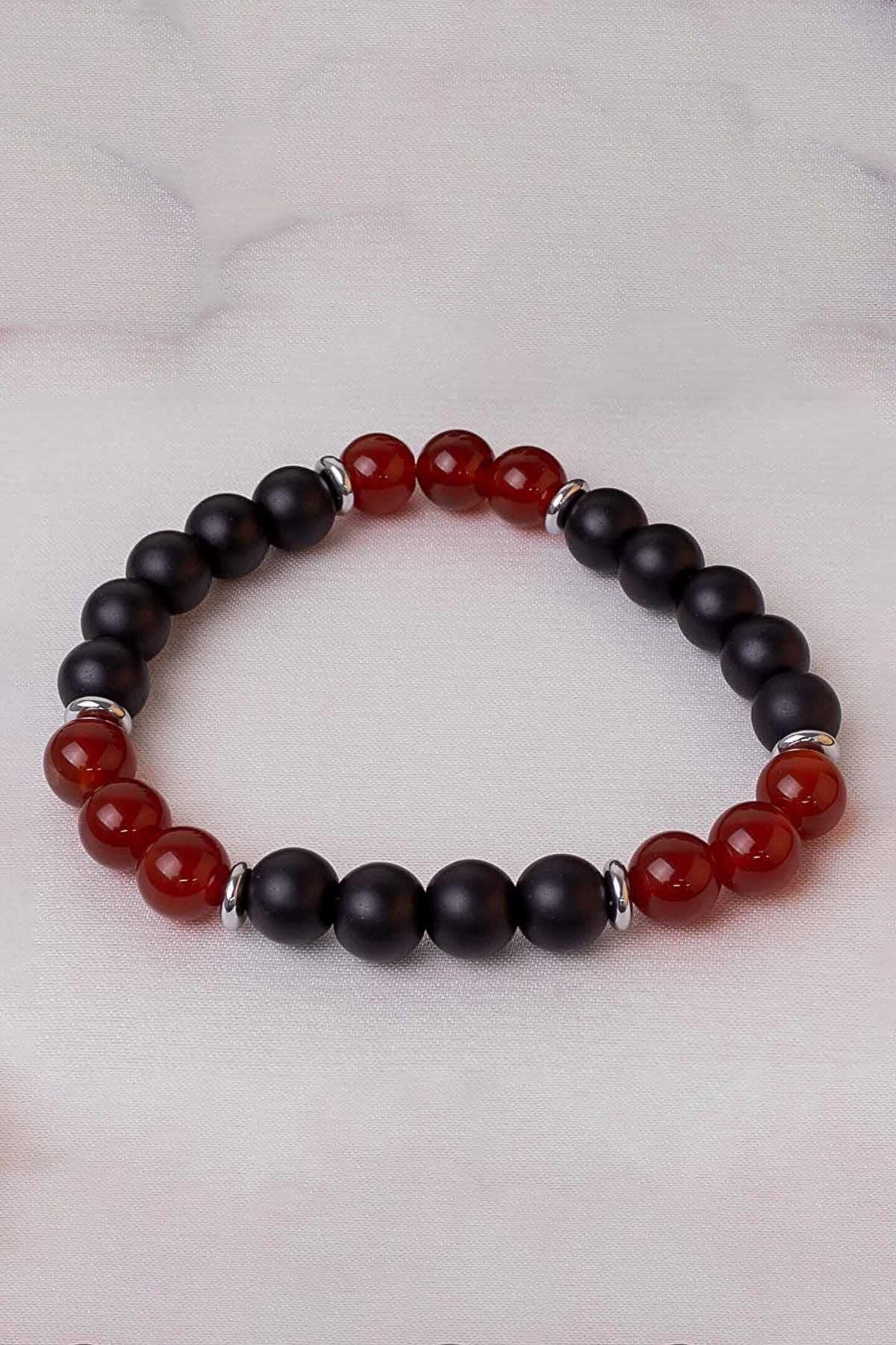 Doğal akik ve oniks taşı kullanılarak üretilmiş, şıklığı ve zarafeti bir arada sunan bileklik; Her bir bileklik, benzersiz desenleri ve renkleriyle dikkat çeken doğal taşların özgün bir kombinasyonunu barındırır; Doğal taş materyali sayesinde, her kullanımda farklı bir deneyim sunar ve doğanın güzelliklerini bileğinizde taşımanızı sağlar; Hem günlük kullanım hem de özel günler için ideal bir aksesuar olarak, stilinizi tamamlayacak zarif bir detaydır;