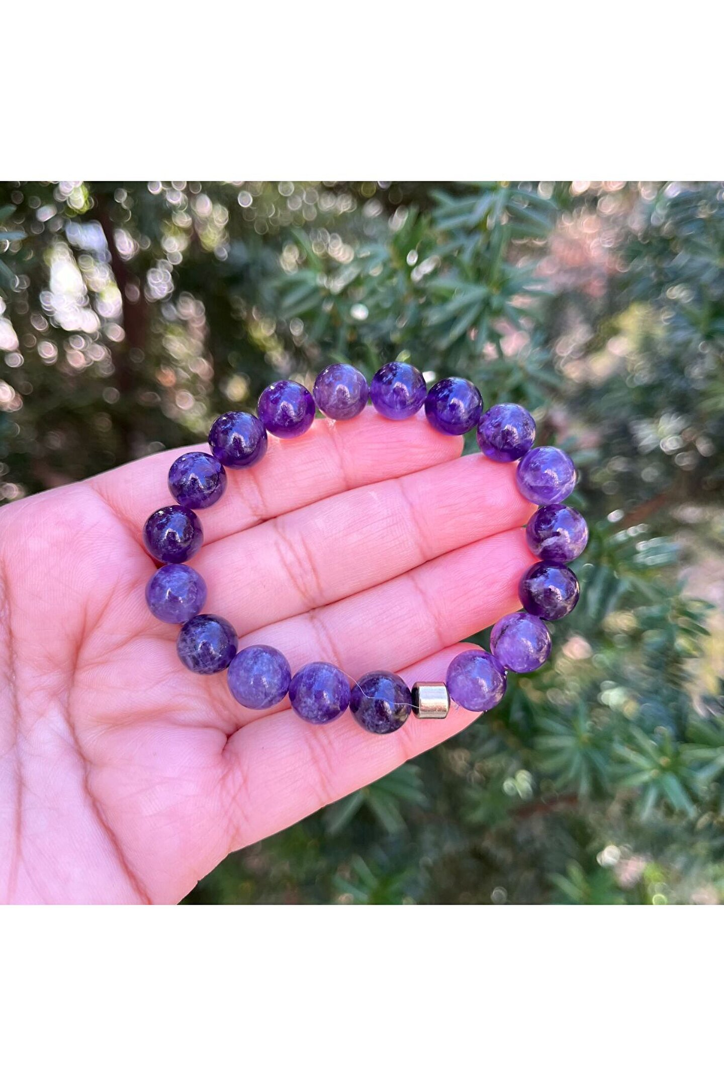 Doğal taş bileklik, şıklığınızı tamamlayacak zarif bir aksesuardır; Ametist taşı, benzersiz renk tonları ve desenleriyle dikkat çeker; 10 mm boyutundaki bu bileklik, hem günlük kullanım hem de özel günler için idealdir; Doğal taş materyali sayesinde her bilek boyutuna uyum sağlar ve konforlu bir kullanım sunar;