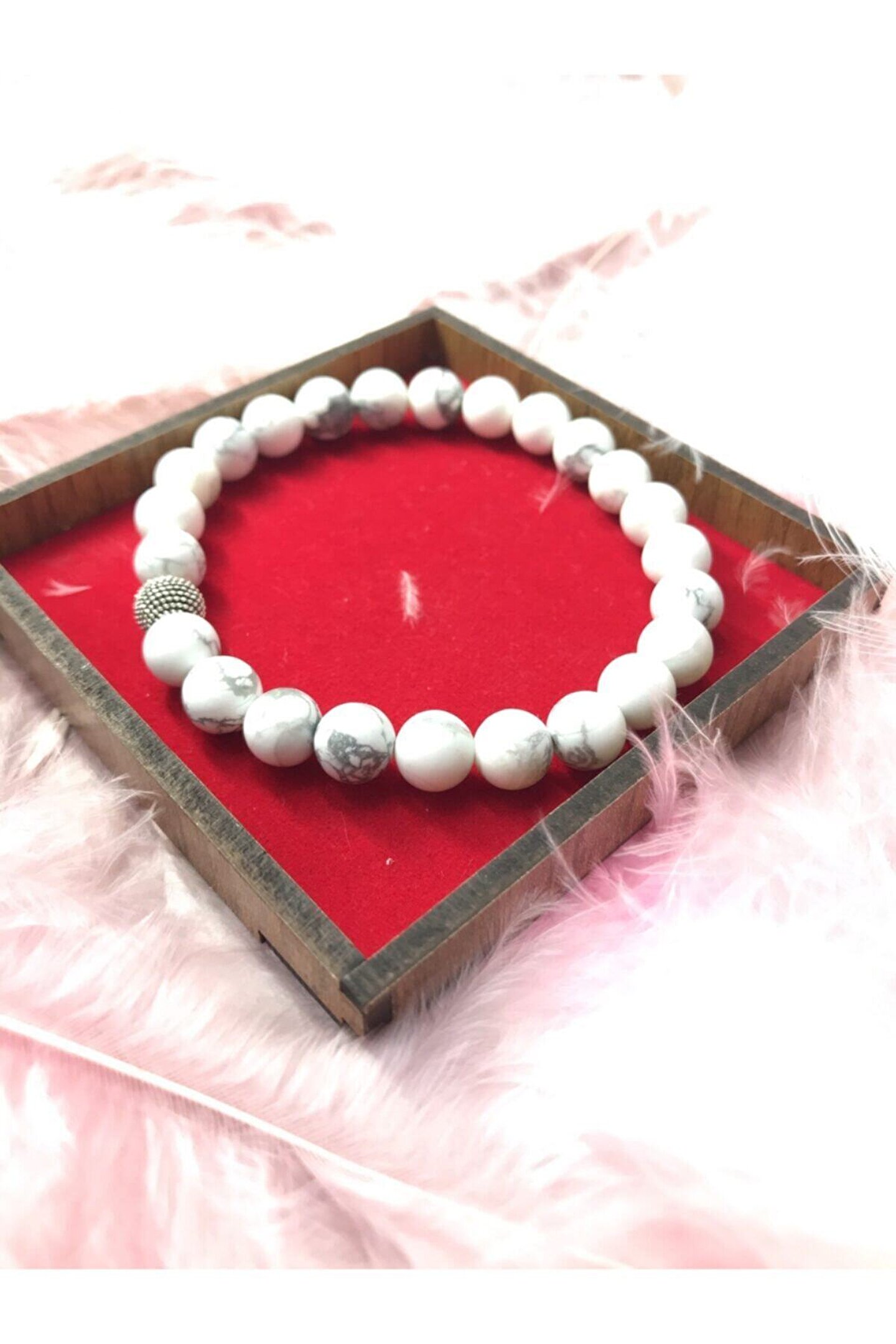 Doğal taş kullanımı sayesinde her bileklik benzersiz ve otantik bir görünüm sunar; Taş cinsi olarak seçilen havlit taşı, bilekliğe zarif bir parlaklık ve estetik bir dokunuş katar; Doğal materyallerin tercih edilmesiyle hem çevre dostu hem de şık bir aksesuar deneyimi yaşatır;