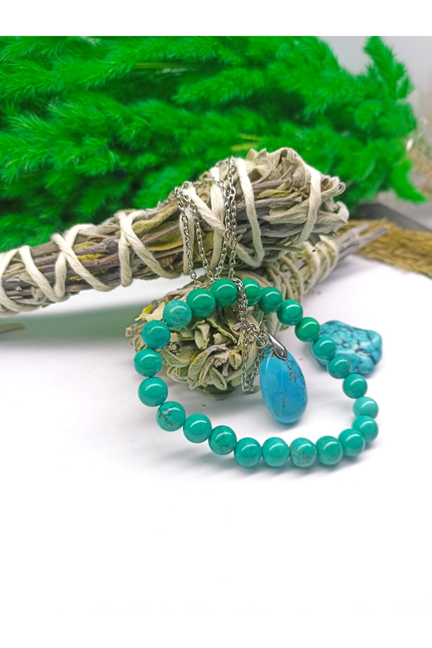 - Doğal taş kullanımı, her bir bilekliğin benzersiz ve otantik bir görünüm kazanmasını sağlar; - Sertifikalı ürünler, kalite ve güvenilirlik açısından önemli bir güvence sunar; - Turkuaz ve firuze gibi renkli taşların birleşimi, göz alıcı bir estetik oluşturur; - Çift tütsü detayı, bilekliğe farklı bir dokunuş katarken aynı zamanda şık bir detay olarak öne çıkar;