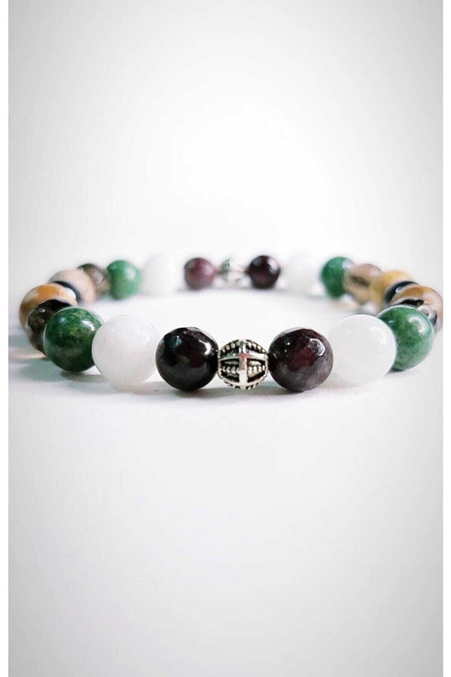 - Doğal taş bileklik, her bir bileklikte bulunan benzersiz desen ve renklerle doğanın zarafetini ve güzelliğini parmaklarınıza taşır; - Lal, aytaşı, yeşim, jasper ve dumanlı kuvars gibi farklı türdeki doğal taşlar, bilekliğinize hem estetik hem de enerji katarken, kişisel stilinizi yansıtır; - Doğal taşların şeffaflığı ve parlaklığı, bilekliğinize doğal bir ışıltı kazandırarak her türlü kıyafetle uyum sağlar; - El yapımı ve özgün tasarımıyla dikkat çeken bu bileklik, günlük kullanım için idealdir ve özel günlerde de şıklığınızı tamamlar; - Doğal taşların sağladığı enerji ve pozitif titreşimler, bilekliğinizi sadece bir aksesuar olarak değil, aynı zamanda kişisel bakımınızın bir parçası haline getirir;