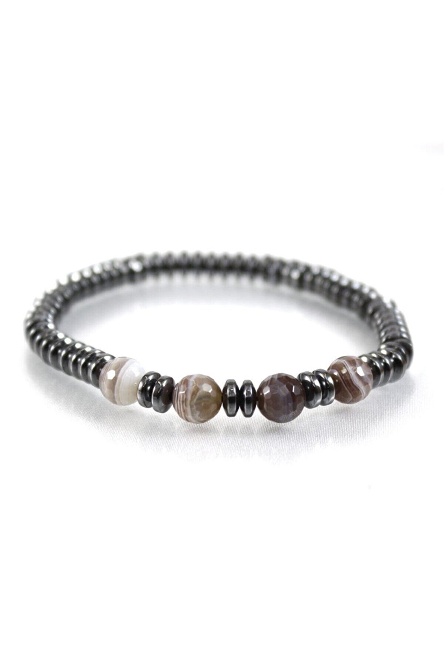 Doğal taş kullanımı, her bir bilekliğin benzersiz ve otantik bir görünüm kazanmasını sağlar; Hematit botswana akik taşı, bilekliğe zarif bir parlaklık ve estetik bir dokunuş katar; Bu bileklik, hem günlük kullanım hem de özel günler için ideal bir aksesuar seçeneği sunar; Doğal taşların sıcaklığını ve doğallığını yansıtan tasarım, her kıyafetle uyum sağlar;