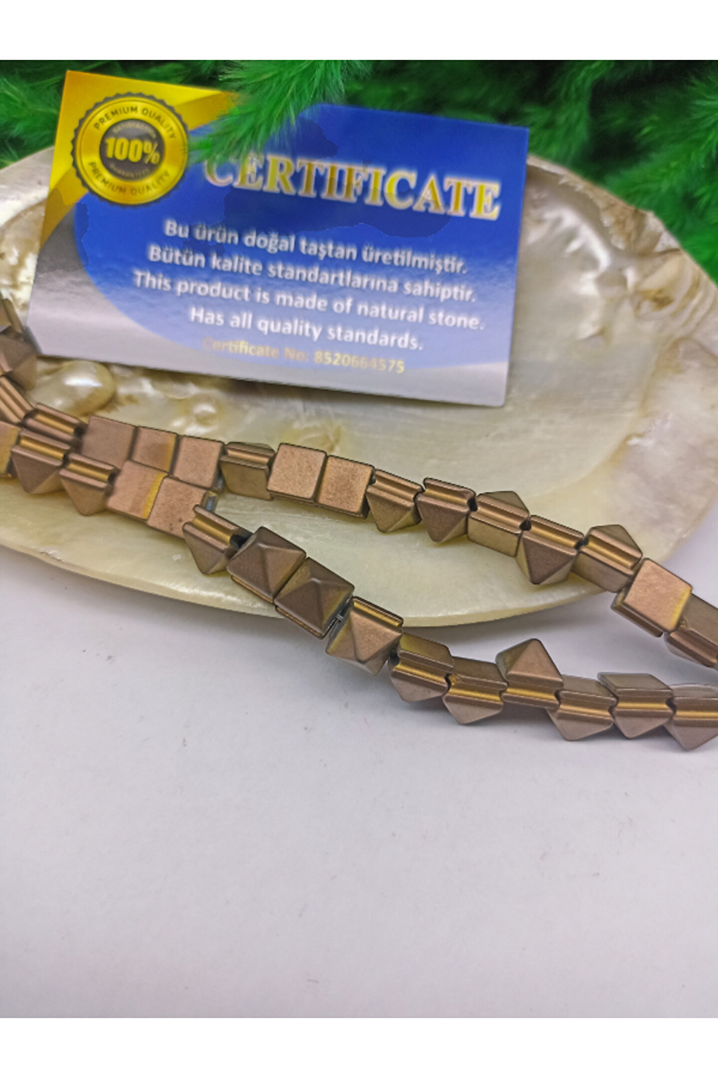 - Doğal hematit taşı, benzersiz ve doğal bir görünüm sunar.; -Hematit Bronz mat kaplama piramit kesim tasarımı, göz alıcı bir parlaklık kazandırır.; - 8x8x8 boyutlarındaki bu taş, hem estetik hem de işlevsel bir kullanım sunar.; - Sertifikalı ürünümüz, kalite ve güvenilirlik açısından sizi temin eder.;