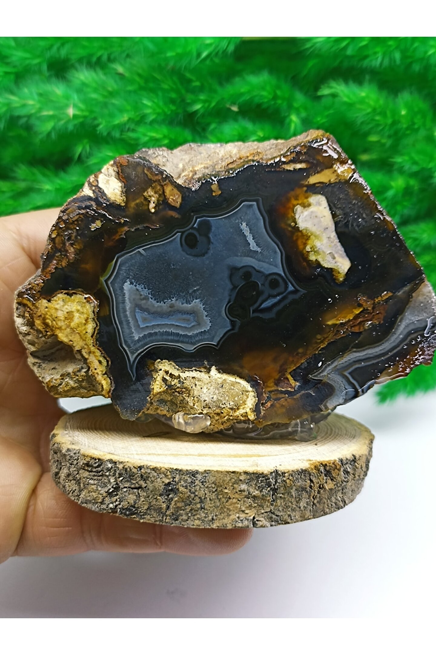 Doğal akik taşı, Madagaskar'dan temin edilmiş ve sertifikalı bir üründür, bu sayede orijinalliği ve kalitesi garanti altındadır; Ahşap stand, doğal taşın estetik görünümünü tamamlar ve dayanıklılığı artırır; Dekoratif obje olarak kullanıma uygun tasarımıyla evinizin veya ofisinizin dekorasyonuna şıklık katar;