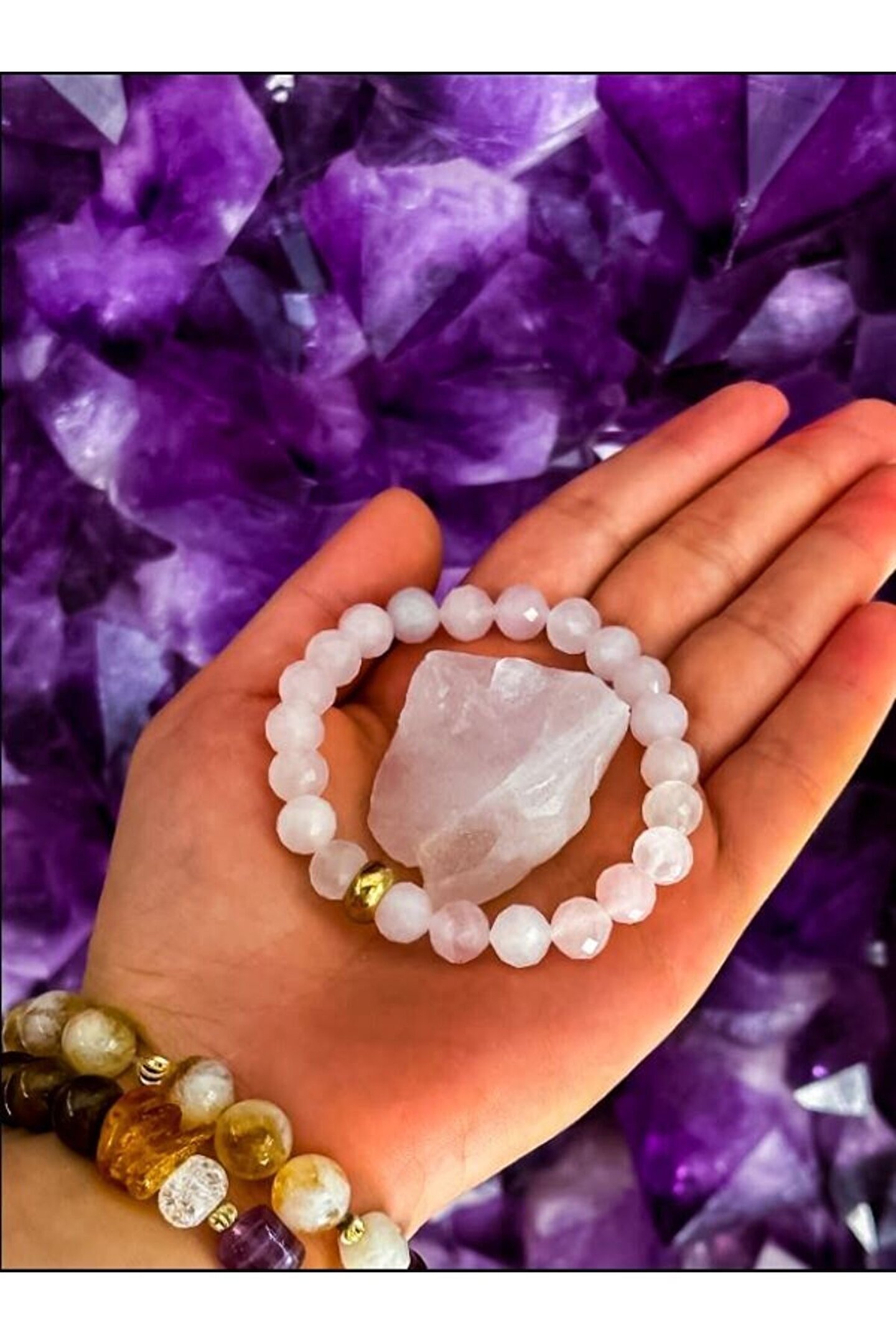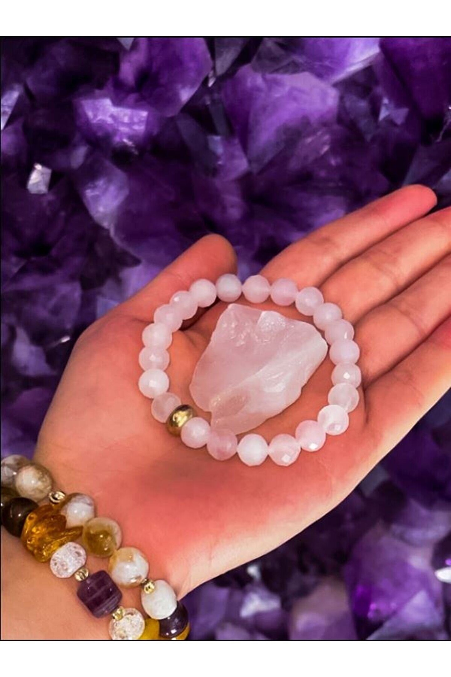 Pembe kuvars, doğal güzelliği ve pozitif enerjisiyle bilinir. Bu ham taş, elmas kesim tekniğiyle işlenerek benzersiz bir parlaklık ve estetik bir görünüm kazandırılmıştır.; 8mm boyutundaki taşlar, bileklikte rahatça kullanılabilir ve kolayca fark edilir. Bu büyüklükteki taşlar, hem şıklığı hem de rahatlığı bir arada sunarak günlük kullanım için idealdir.; Pembe kuvarsın sakinleştirici ve pozitif etkileri, takının enerjisini yükseltirken, bileğinizde de zarif bir dokunuş sağlar. Bu bileklik, sadece aksesuar olarak değil, aynı zamanda kişisel enerjinizi arttırmak için de harika bir seçimdir.; Elmas kesim ham taş, ışığı mükemmel şekilde yansıtarak göz alıcı bir parlaklık sunar. Bu kesim tekniği, taşın doğal güzelliğini daha da ön plana çıkarmakta ve takının ışıltısını artırarak dikkat çekici bir görünüm kazandırmaktadır.; Bijuteri bileklik olarak tasarlanmış olan bu ürün, farklı tarzlara uyum sağlayarak geniş bir kullanıcı kitlesine hitap etmektedir. Hem gündelik hem de resmi ortamlarda rahatlıkla kullanılabilir, her türden kıyafetle mükemmel uyum sağlar.; Pembe kuvarsın doğal yapısı sayesinde, bu bileklikte kullanılan ham taşlar çevre dostu ve sürdürülebilir bir şekilde elde edilmiştir. Bu sayede hem estetik hem de etik bir seçim yapmış olursunuz.; Pembe kuvarsın pozitif enerjisiyle dolu bu ham taş bileklik, hem kendiniz için hem de sevdikleriniz için mükemmel bir hediye seçeneği olabilir. Günlük kullanımda rahatlık sunarken aynı zamanda özel günlerde de şık bir aksesuar olarak yerini alır.;