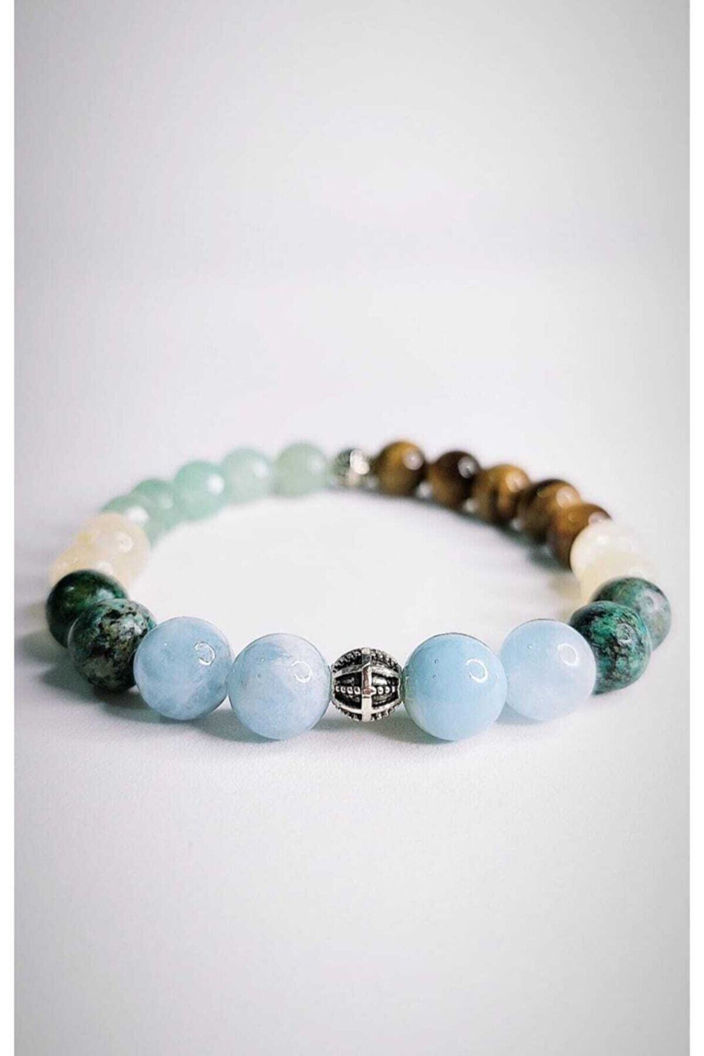 Doğal taşların şıklığını ve enerjisini bileğinizde hissedin: Akuamarin, krizopraz, kaplan gözü, aventurin ve sitrin gibi farklı doğa taşlarından oluşan bu bileklik, her kıyafetle uyum sağlayarak stilinizi tamamlar; Unisex tasarımı ile hem kadınlar hem de erkekler için ideal bir aksesuar seçeneği sunar; herkesin tarzına ve zevkine hitap eder; Doğal taşların benzersiz renk ve desenleriyle dikkat çeken bu bileklik, günlük kullanımın yanı sıra özel günlerde de tercih edilebilir; Doğal taşların pozitif enerjisi sayesinde, bu bileklik ile kendinizi daha huzurlu ve dengeli hissedebilirsiniz;